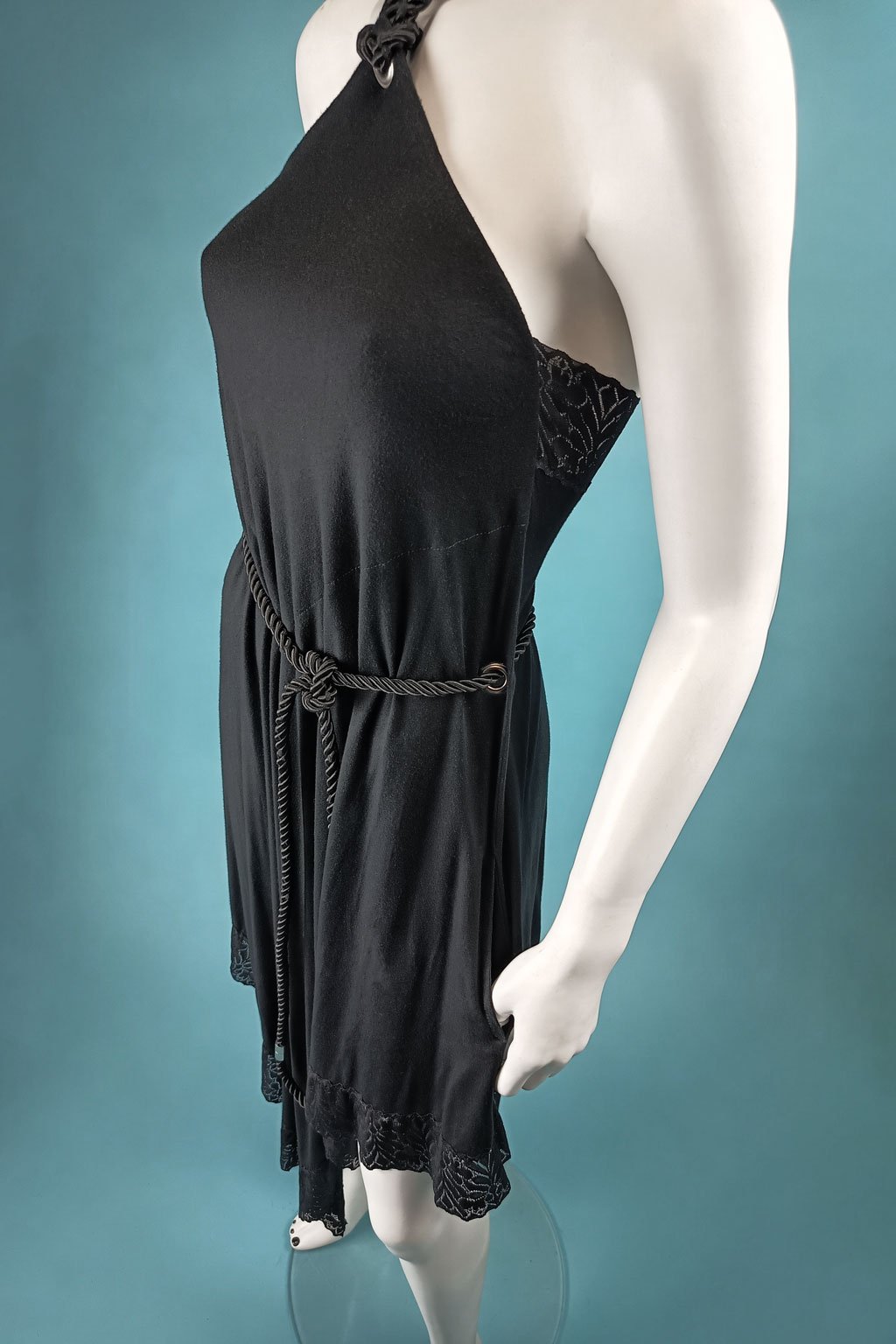 Elegantní černé šaty volného střihu, které kombinují pohodlí a styl, jsou perfektní volbou pro každou příležitost. Tyto šaty jsou lemované jemnou krajkou, která přidává nádech romantiky a ženskosti. V pase se šaty dají převázat různými způsoby, což umožňuje přizpůsobení podle vašich preferencí a vytváření různých siluet. Za krkem je praktické magnetické zapínání, které usnadňuje oblékání, a hluboký výstřih na zádech dodává odvážný a sofistikovaný vzhled.