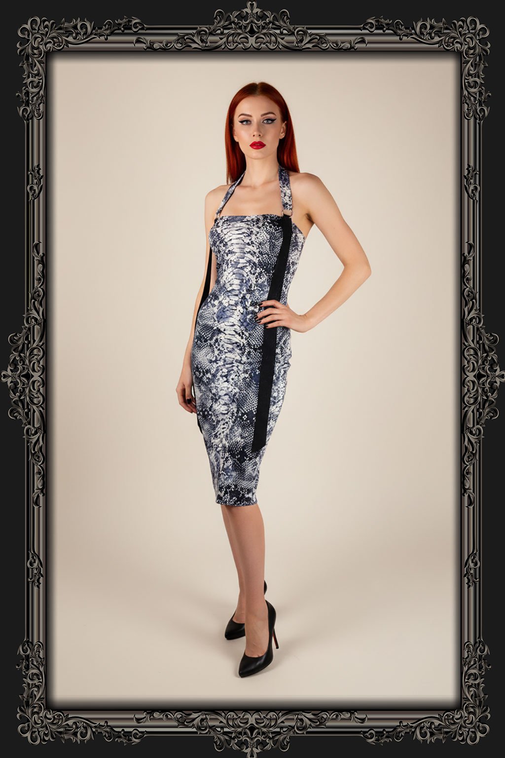 Elegantní pouzdrové šaty v délce pod kolena s ramínkem za krk a ozdobnou stuhou. Vyrobené jsou z pevnějšího elastického materiálu, přes prsa je materiál dvojitý, pod prsy je všitá guma se silikonovým páskem, aby dobře držely.