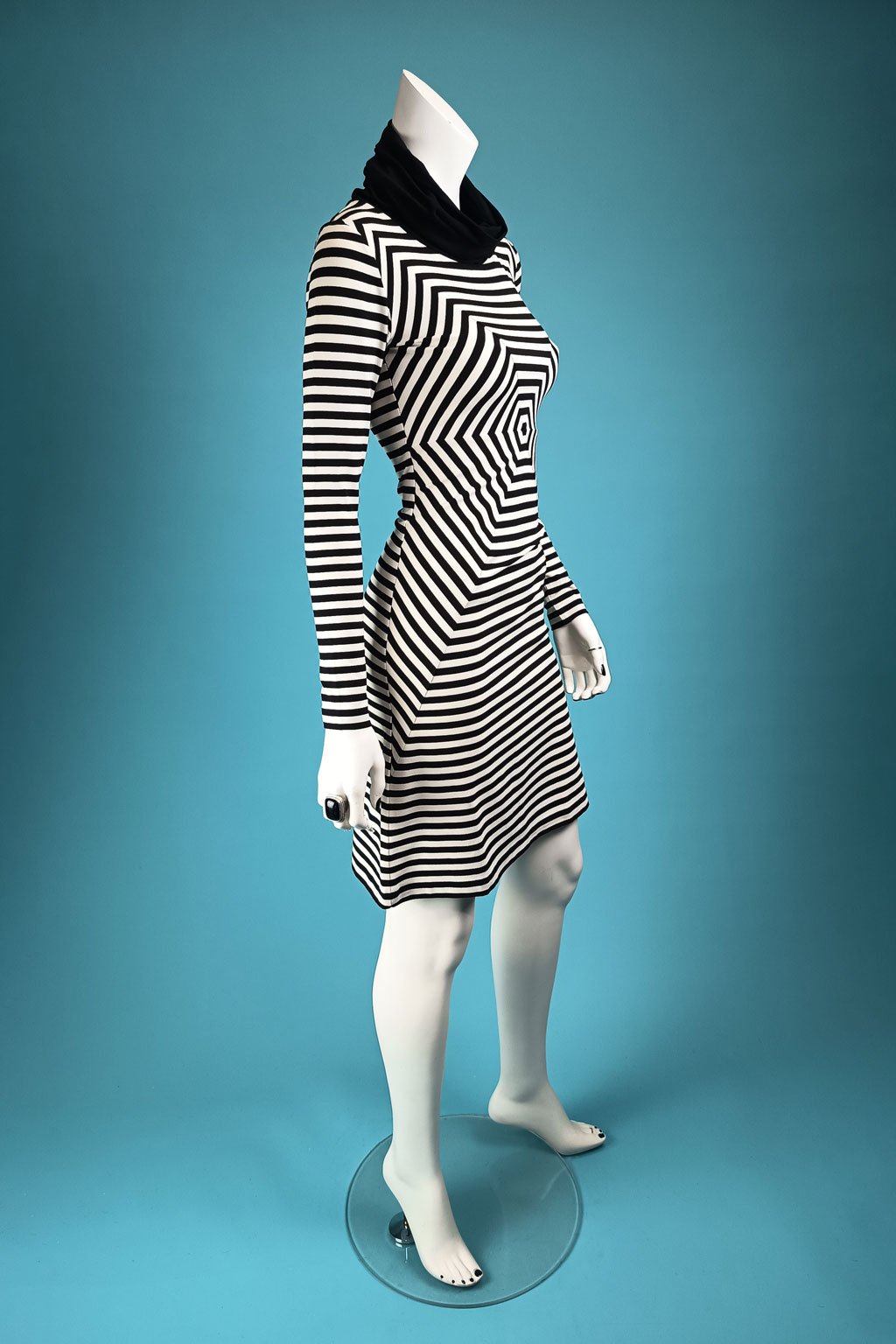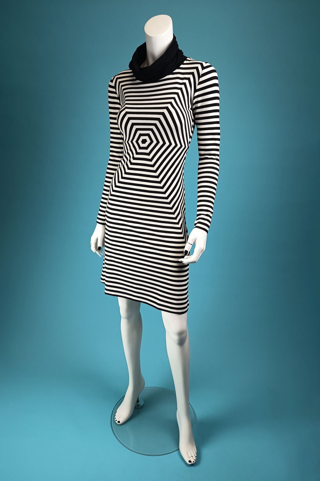 Elegantní pruhované šaty s ručně sesazeným šestiúhelníkem a volným velkým rolákem. Díky optickému klamu krásně zakryjí malé bříško, ideální jsou pro rovnější postavy s větším poprsím.