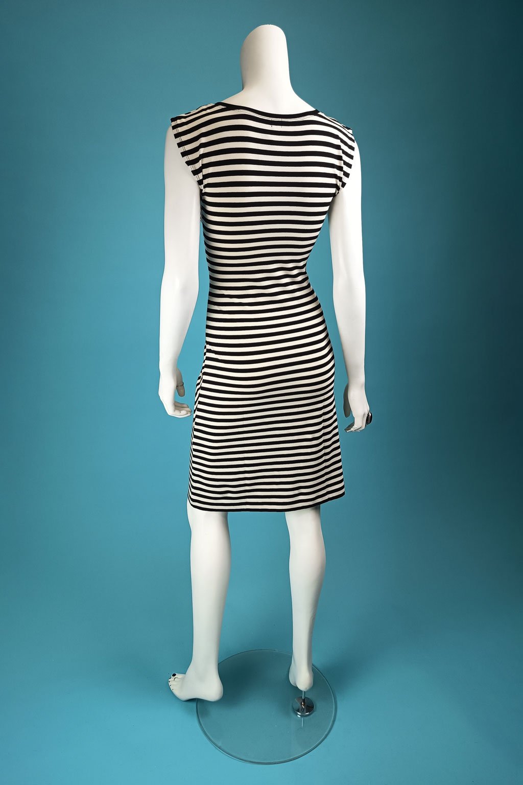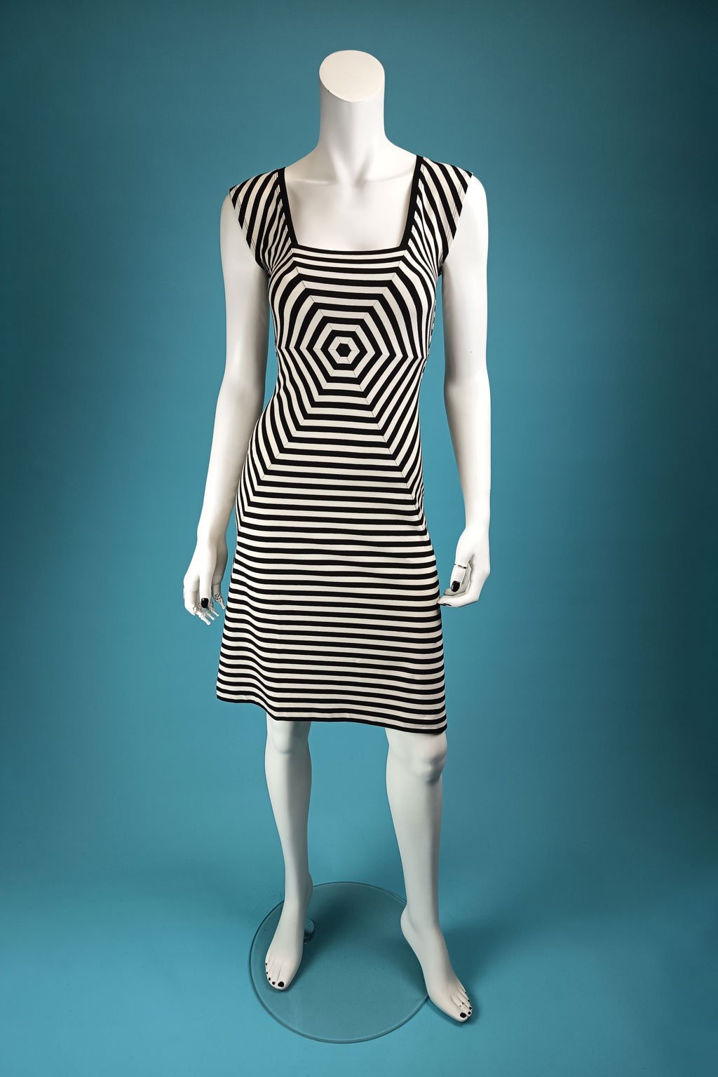 Elegantní pruhované šaty s šestiúhelníkem a hranatým výstřihem. Díky optickému klamu krásně zakryjí malé bříško, ideální jsou pro rovnější postavy s větším poprsím. Vybrat si můžete lehčí verzi bez rukávů nebo teplejší model s dlouhými rukávy.