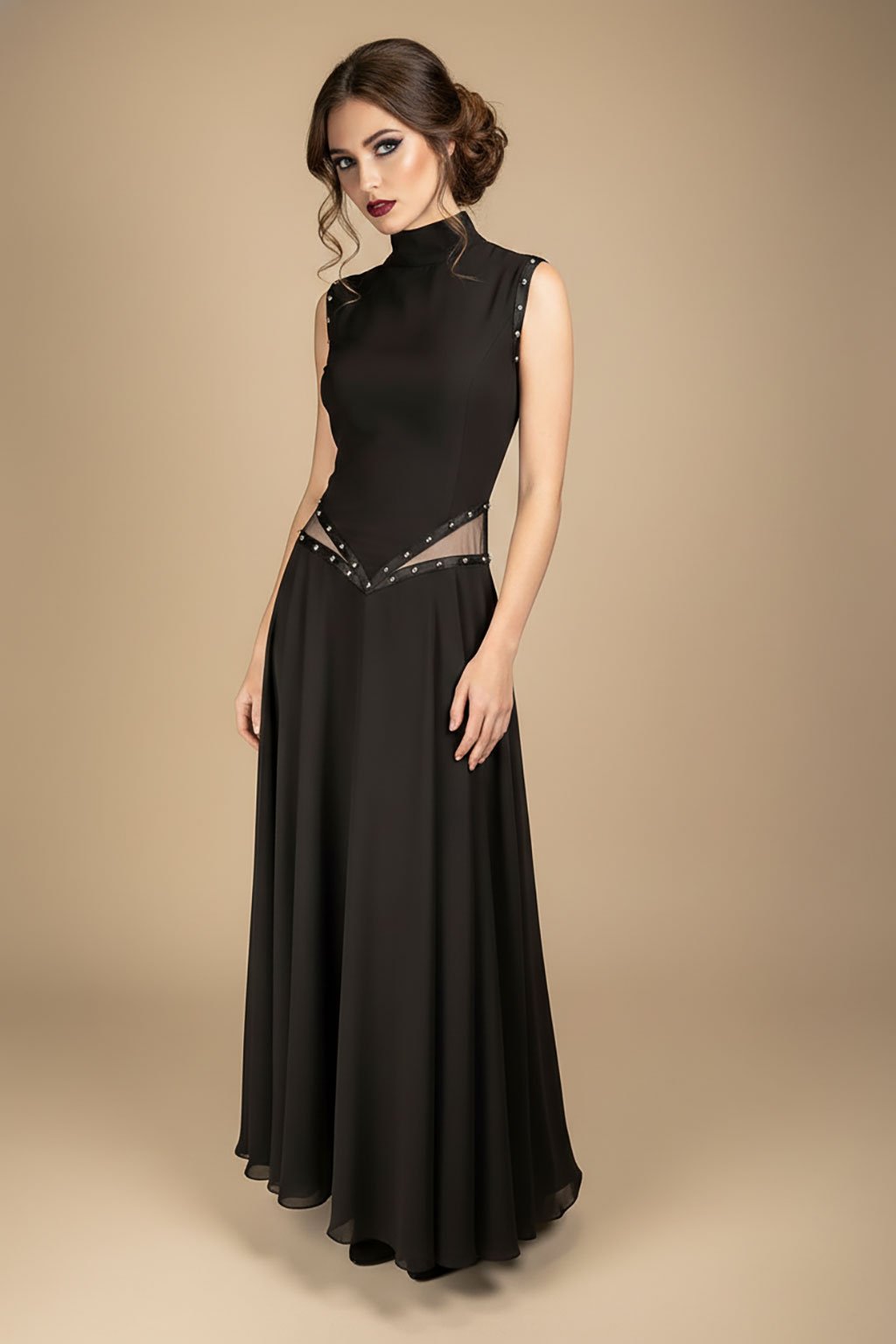 Silver Cut Noir jsou dlouhé společenské šaty s kolovou sukní a bezrukávovým živůtkem se stojáčkem, vyrobené pouze v jednom jediném kuse. Záda zdobí rafinovaný transparentní průstřih směřující až do předního dílu, lehký černý šifon je lemovaný saténovou stuhou zdobenou stříbrnými peckami.