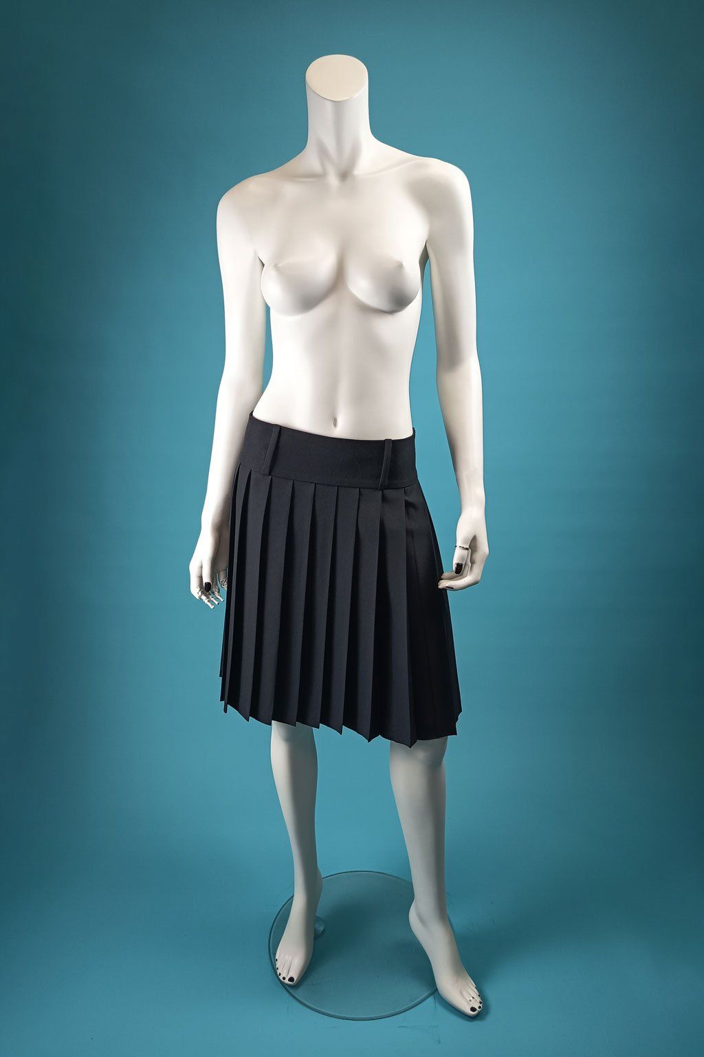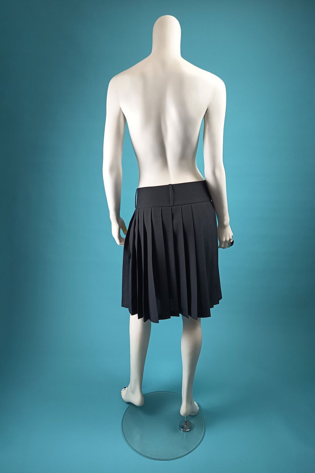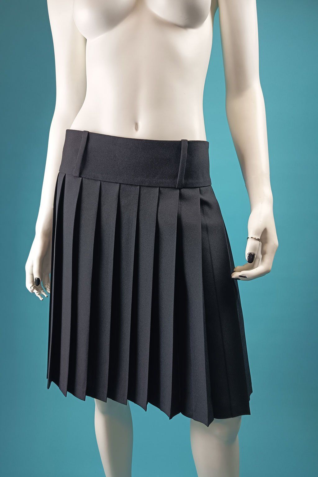 Černá skládaná sukně s mírně sníženým, tvarovaným pasem. Zaujme ozdobnými poutky pro protažení opasku, která dodávají modelu elegantní a promyšlený detail. Sukně je vyrobená z lehkého materiálu, který se nemačká, dobře drží tvar a je velmi snadný na údržbu. Skvěle se hodí pro každodenní nošení i formálnější příležitosti.
