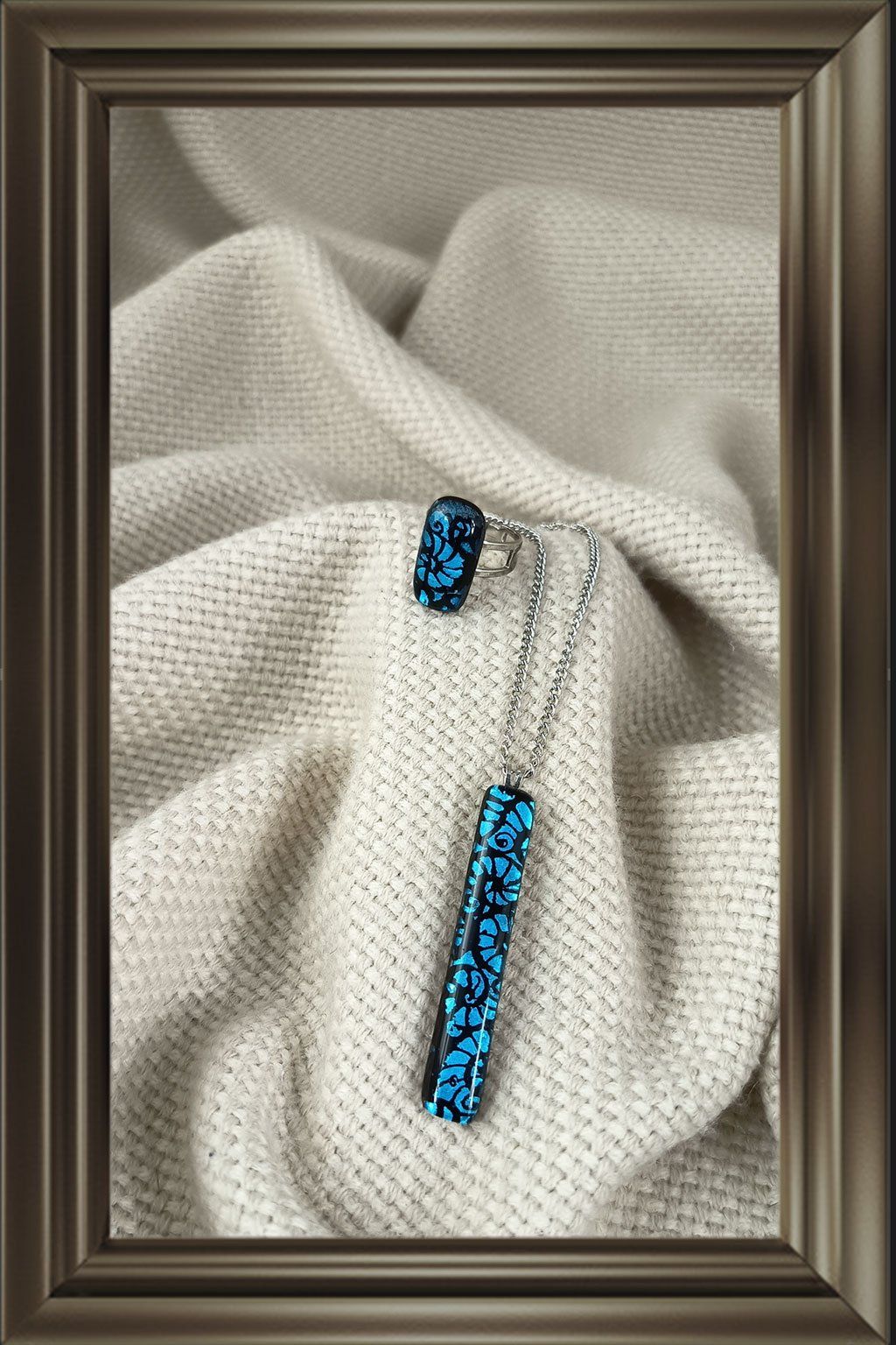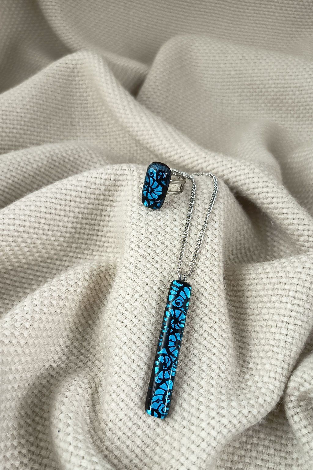 Přívěsek je zavěšen na řetízku z nerezové oceli, který je odolný, dobře se nosí a skvěle doplňuje výraz skleněného šperku. Prsten s přívěskem tvoří harmonický celek, který se hodí jak pro běžné nošení, tak i pro slavnostnější příležitosti. Krásná volba pro ženy, které oceňují ruční práci, kvalitní materiály a originální design.