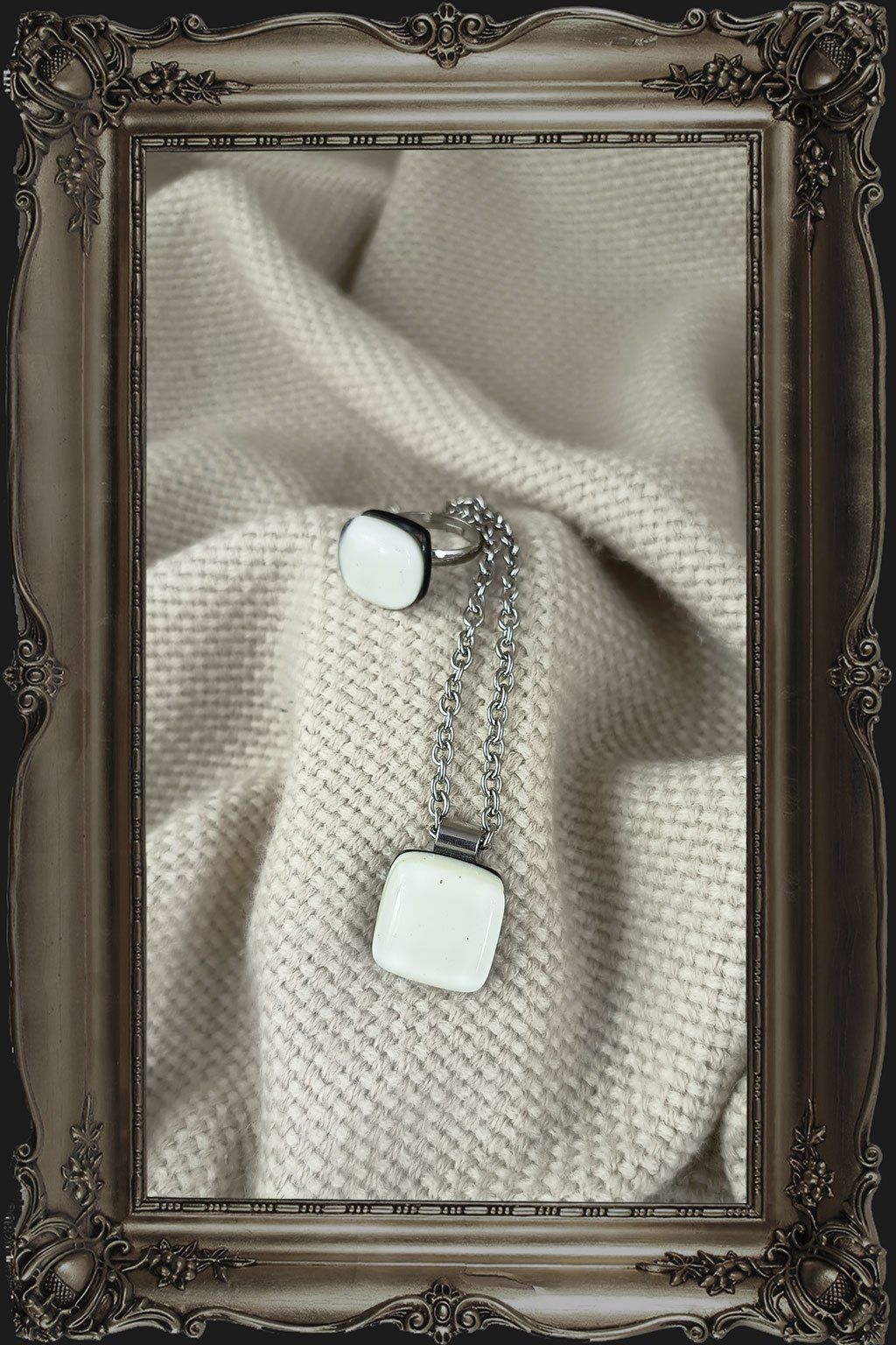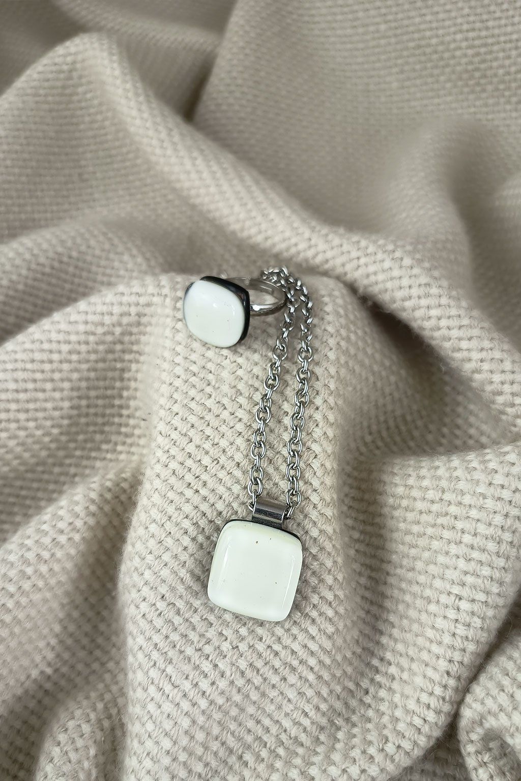 Přívěsek je zavěšen na řetízku z nerezové oceli, který je odolný, dobře se nosí a skvěle doplňuje výraz skleněného šperku. Prsten s přívěskem tvoří harmonický celek, který se hodí jak pro běžné nošení, tak i pro slavnostnější příležitosti. Krásná volba pro ženy, které oceňují ruční práci, kvalitní materiály a originální design.