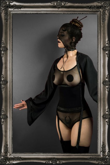 Černá krajková souprava spodního prádla. Kalhotky - brazilky a košilka s krajkovými košíčky.