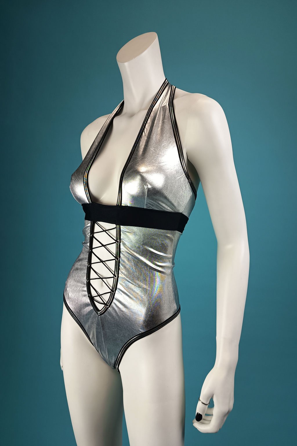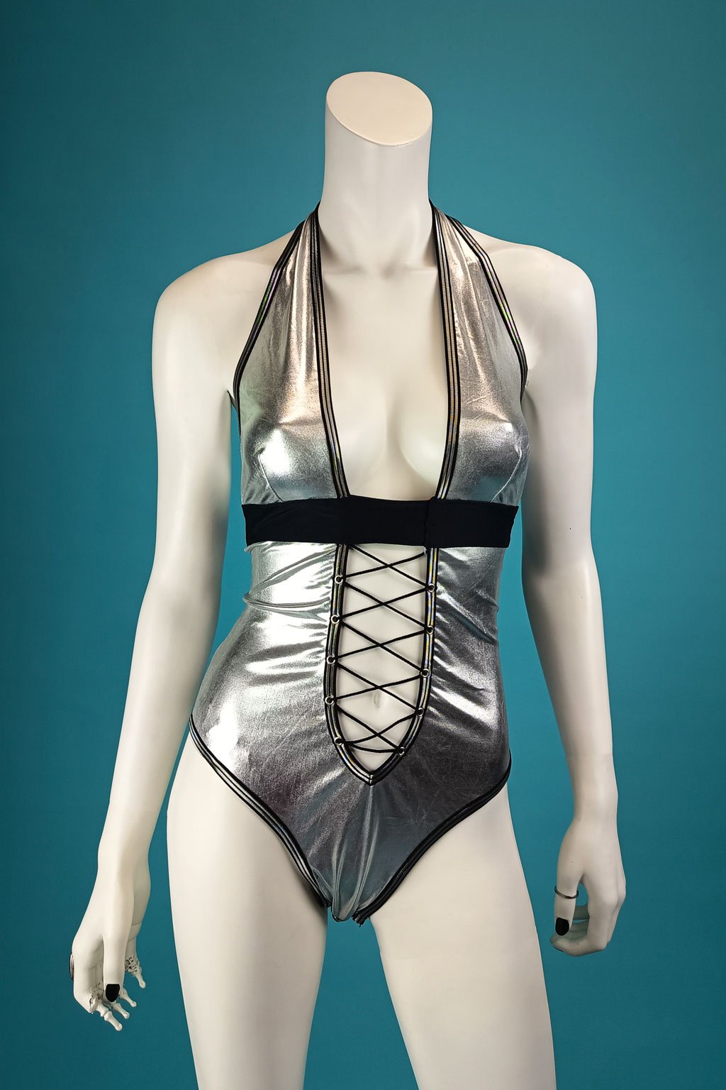 Vstupte do světa elegance a stylu s naším stříbrným body z velmi lesklého materiálu. Toto body jsou navrženy tak, aby zvýraznilo vaši postavu a dodalo vám sebevědomí. Hluboké šněrování na předním díle přidává šmrnc a umožňuje, aby body perfektně sedělo. Ať už se chystáte na dovolenou nebo na párty, s tímto body budete vždy vypadat šik a moderně. Přidejte tento stylový kousek do své garderoby a užijte si jeho jedinečný design a kvalitu.