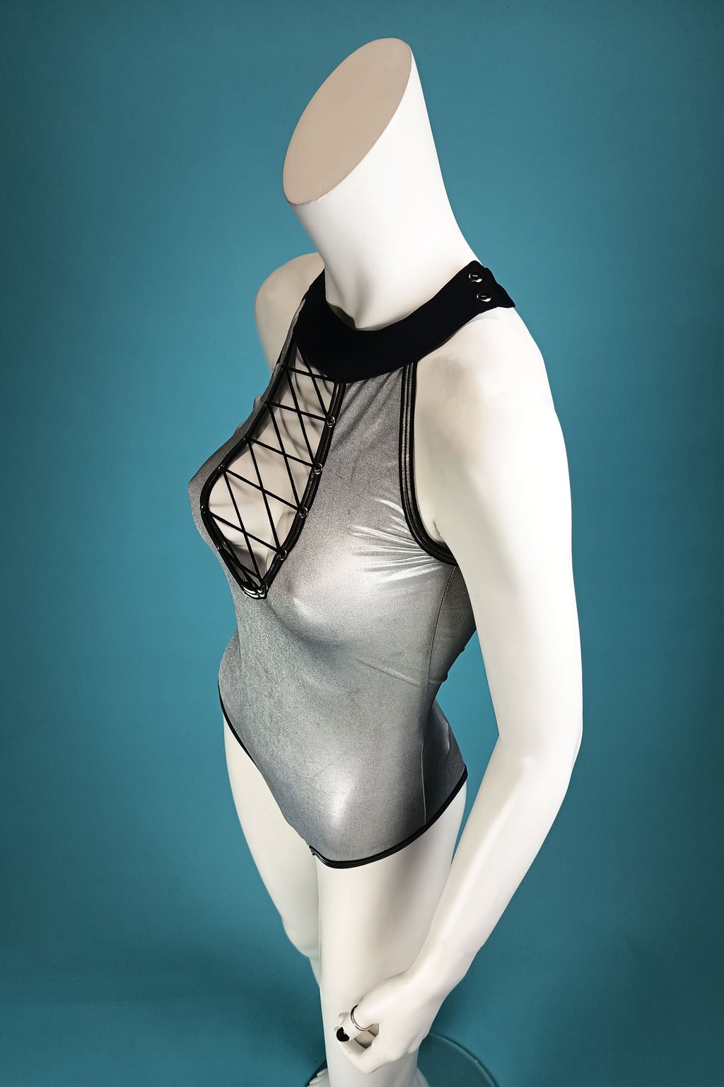 Vylepšete svůj šatník tímto úchvatným stříbrným body, které je stvořené pro sebevědomé ženy, které se nebojí zazářit! Lesklý materiál a šněrování v dekoltu dělají z tohoto kousku nezapomenutelný doplněk pro každou příležitost. Střih brazilky na zadní straně zajišťuje perfektní fit a pohodlí po celý den. Připravte se na obdivné pohledy a pocit sebevědomí, který přináší tento jedinečný kousek.