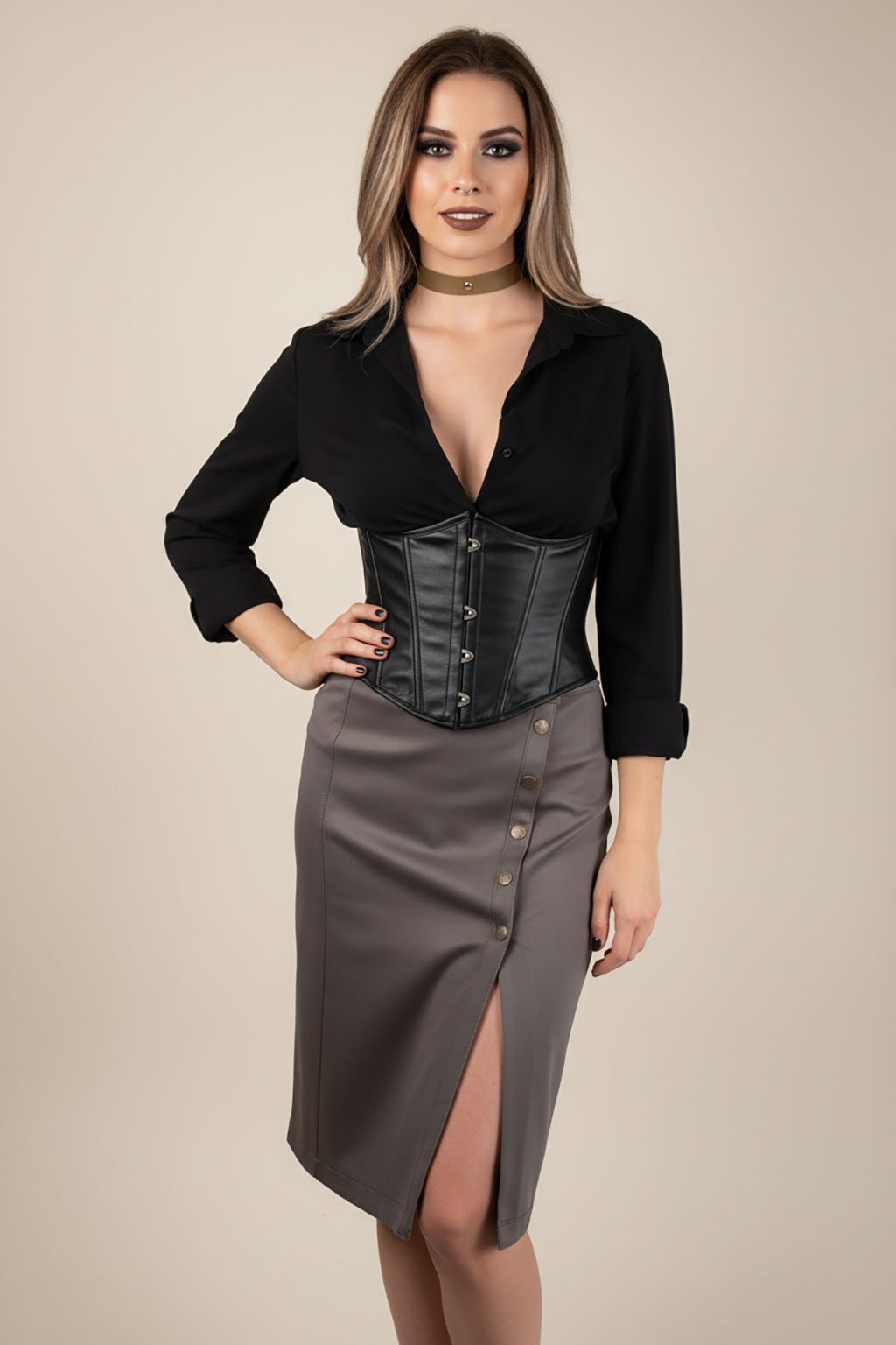 Elegantní pouzdrová zavinovací sukně s vysokým rozparkem, zapínaná na řadu patentů. Vyrobená je ze silnějšího mírně elastického plátna v khaki zelené barvě.