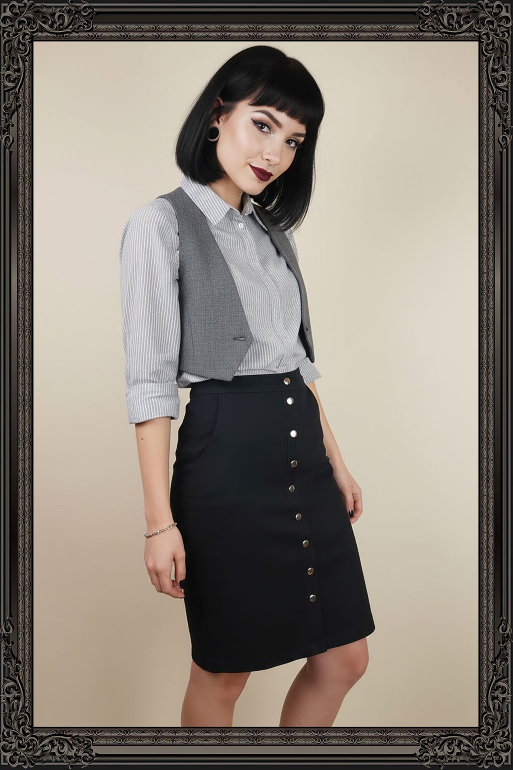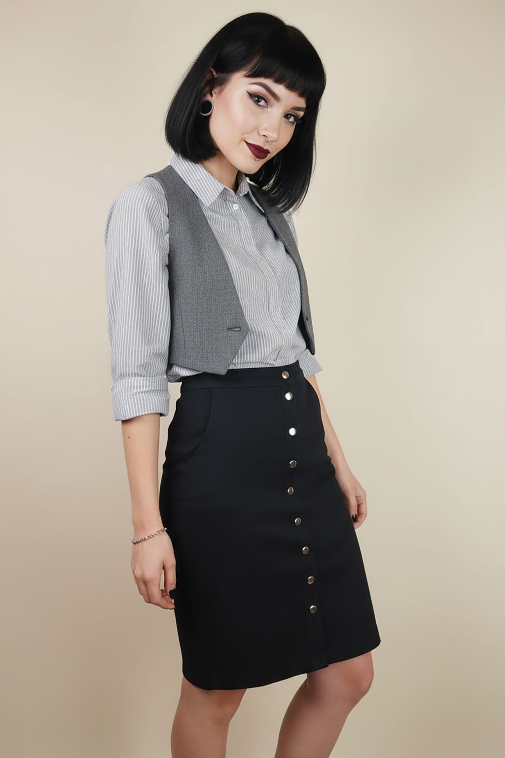 Elegantní propínací pouzdrová sukně, zapínaná na řadu patentů, díky kterým si můžete nastavit výšku rozparku. Vyrobená je z pevného, mírně elastického plátna.