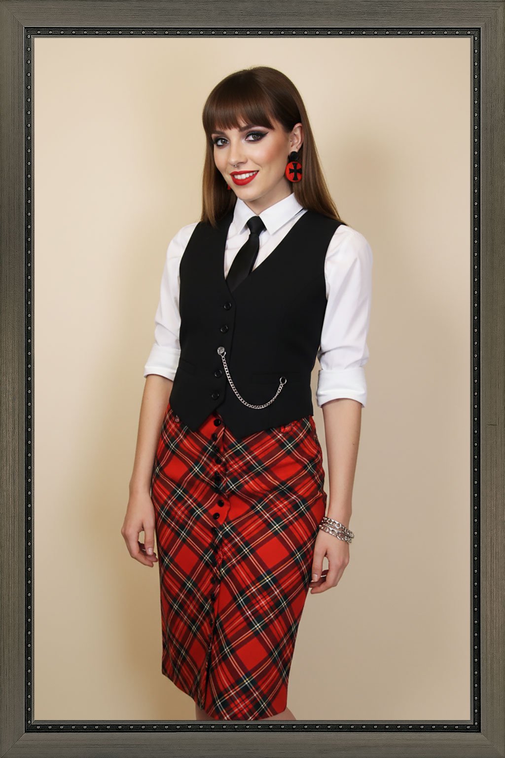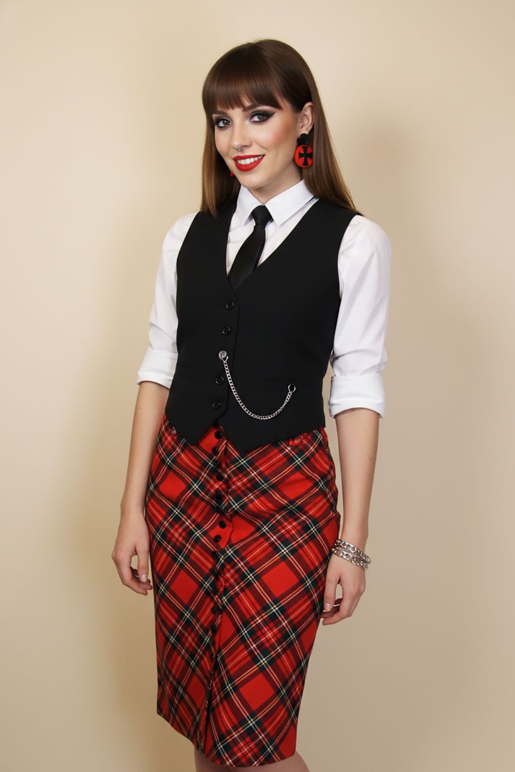 Elegantní propínací pouzdrová sukně, zapínaná na řadu knoflíků, díky kterým si můžete nastavit výšku rozparku. Vyrobená pouze jedna z červeného tartanu ve velikosti 38.