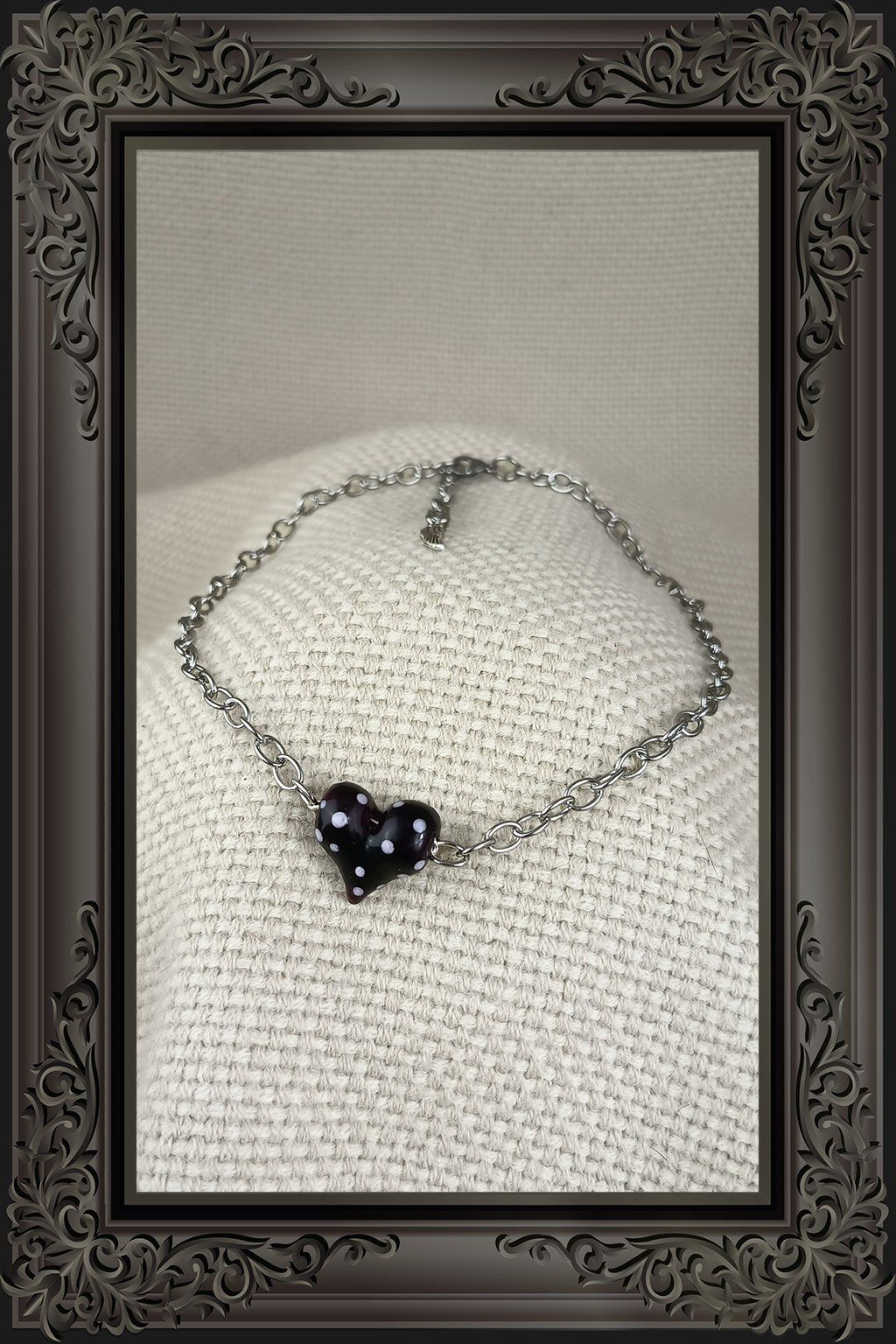 Doplňte svůj styl o jemný šperk se srdcem a nápadem. Ručně vyrobený skleněný korálek s puntíky ve tvaru srdce na nerezovém řetízku spojuje originalitu, romantický motiv a poctivé ruční zpracování.