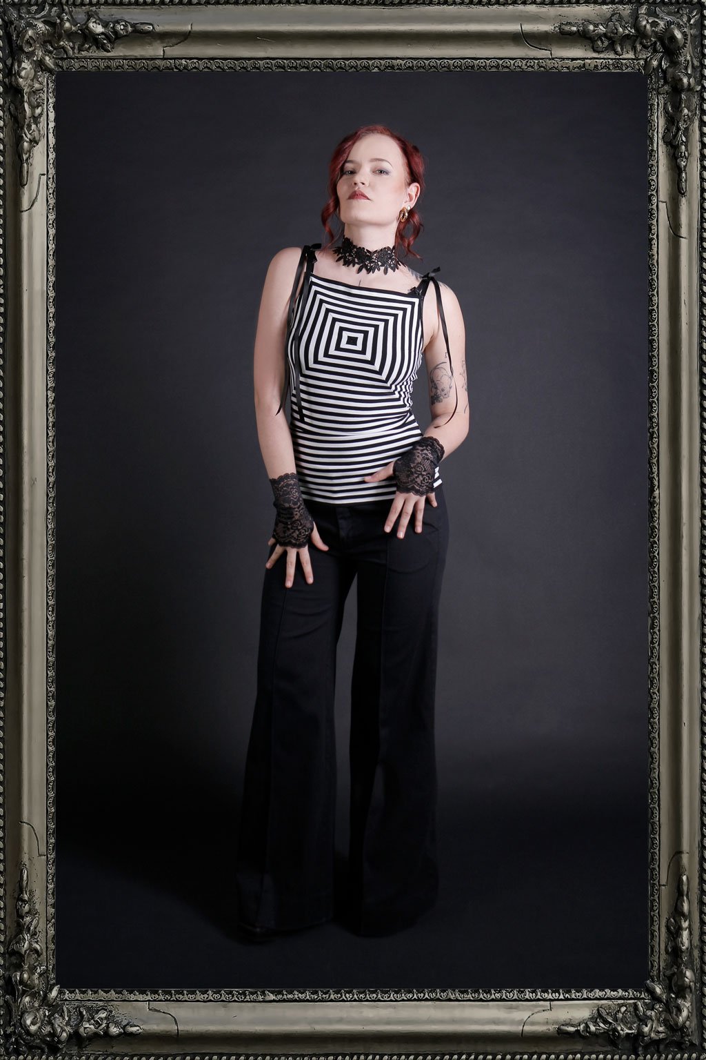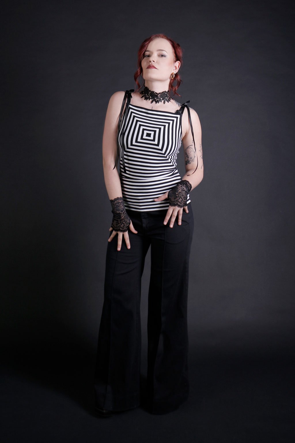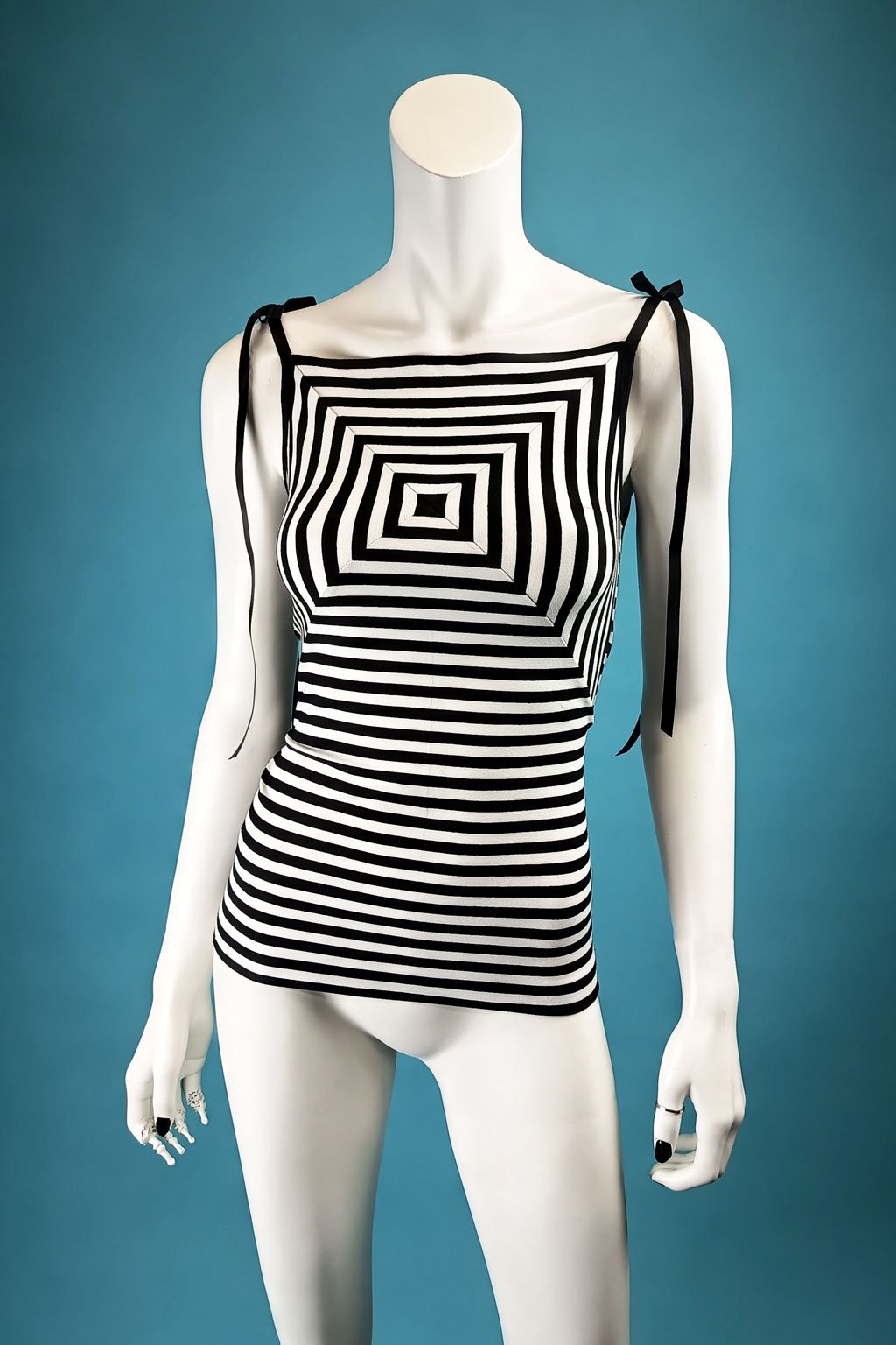 Představujeme vám unikátní pruhované tílko, které je výsledkem precizní ruční práce a uměleckého citu. Každý kousek tohoto tílka je jedinečný díky ručně sesazenému vzoru do čtverce, který přináší originální a stylový vzhled. Tílko je navrženo s hranatým výstřihem, který elegantně zvýrazňuje dekolt a přidává moderní nádech. Na ramenou se tílko zavazuje na dlouhou stuhu, což umožňuje přizpůsobení délky a pohodlí podle vašich potřeb. Tento detail dodává celkovému designu jemný a romantický prvek.
