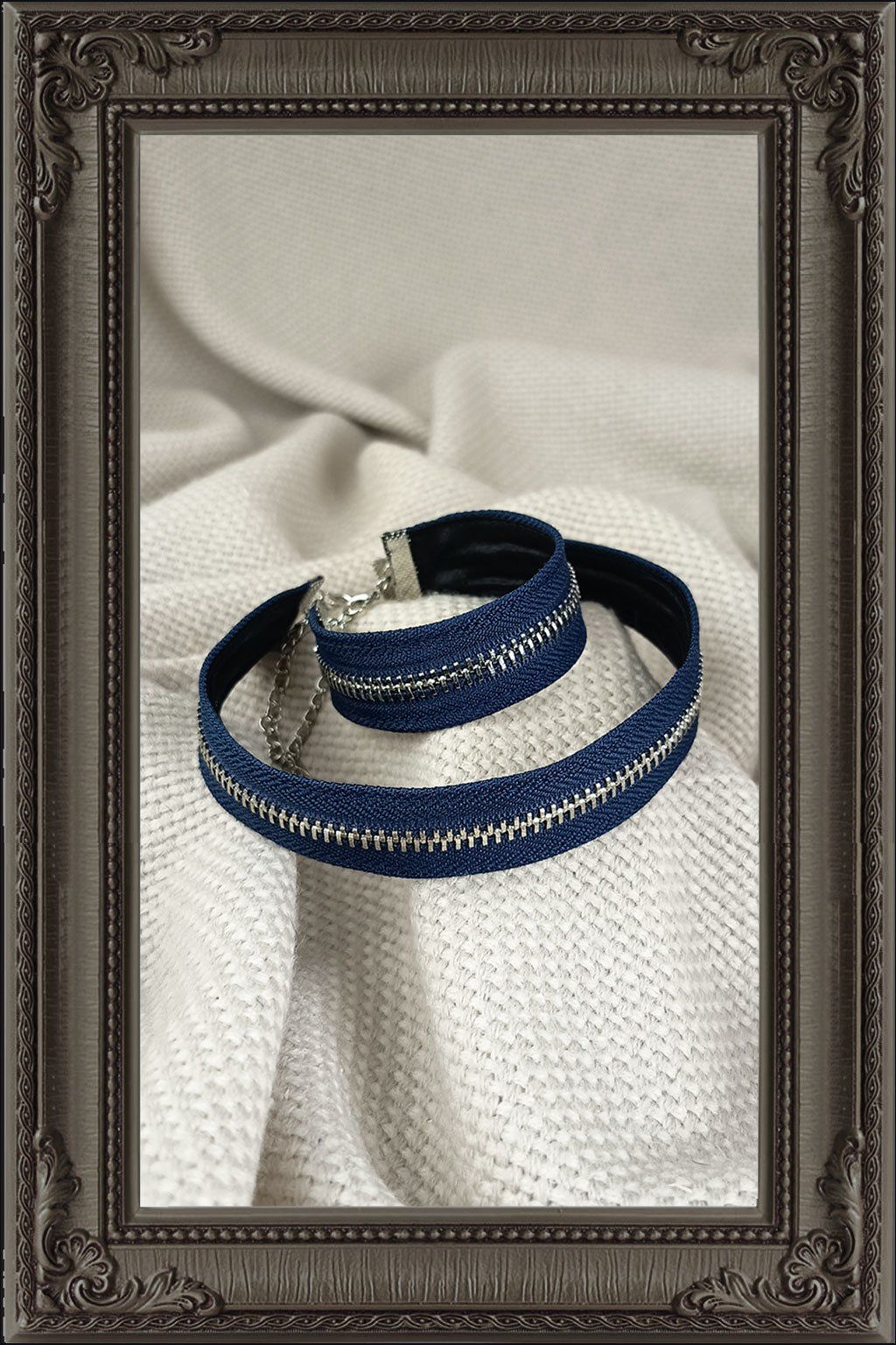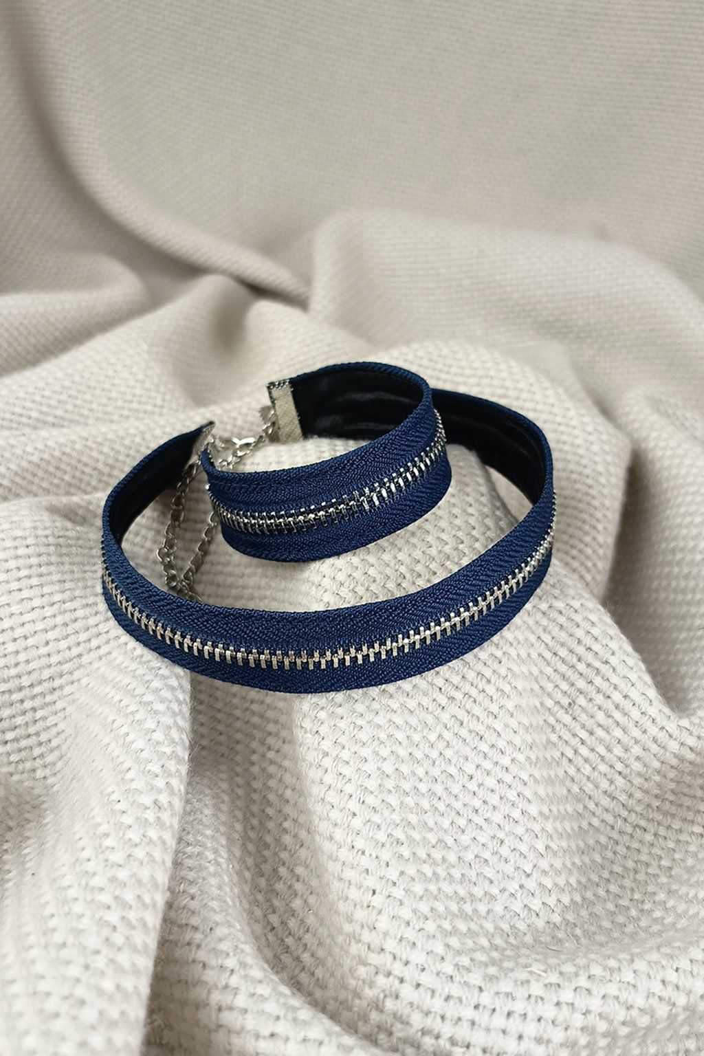 Ručně vyrobená souprava chokeru a náramku v tmavomodrém provedení je originální doplněk pro všechny, kdo mají rádi výrazný styl a netradiční detaily. Tmavomodrá barva působí elegantně a zároveň osobitě, zatímco stříbrný zip dodává celé soupravě moderní a lehce industriální vzhled.