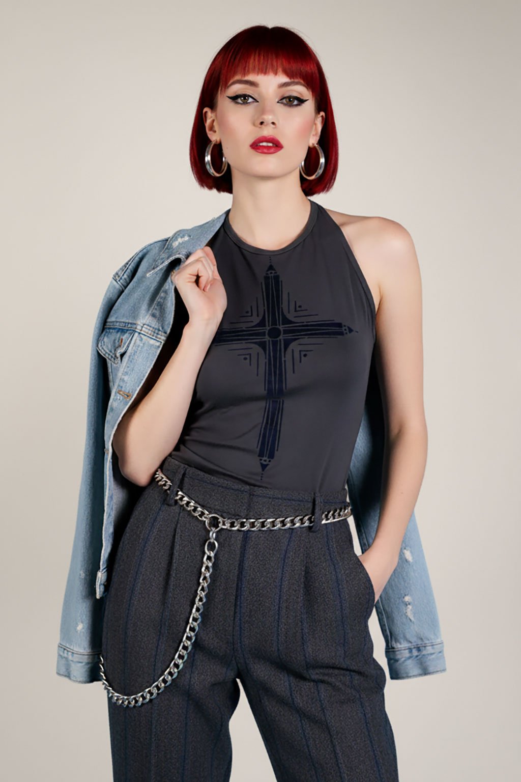 Top se zavazováním za krkem a potiskem kříže střihu Rocket. Tmavě šedý podklad se sametovým temně modrým potiskem. Vyroben pouze jeden kus v této barevné kombinaci!
