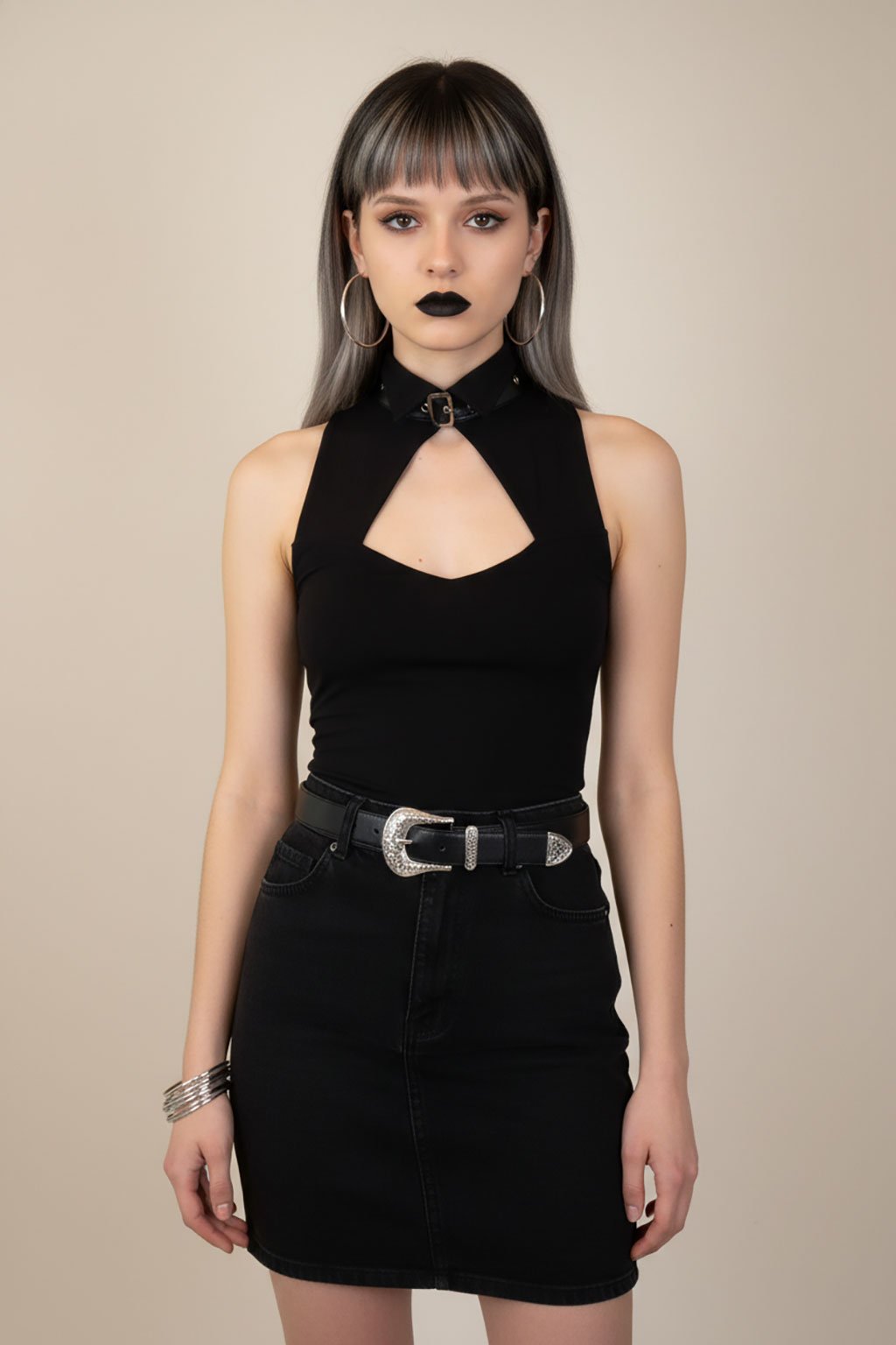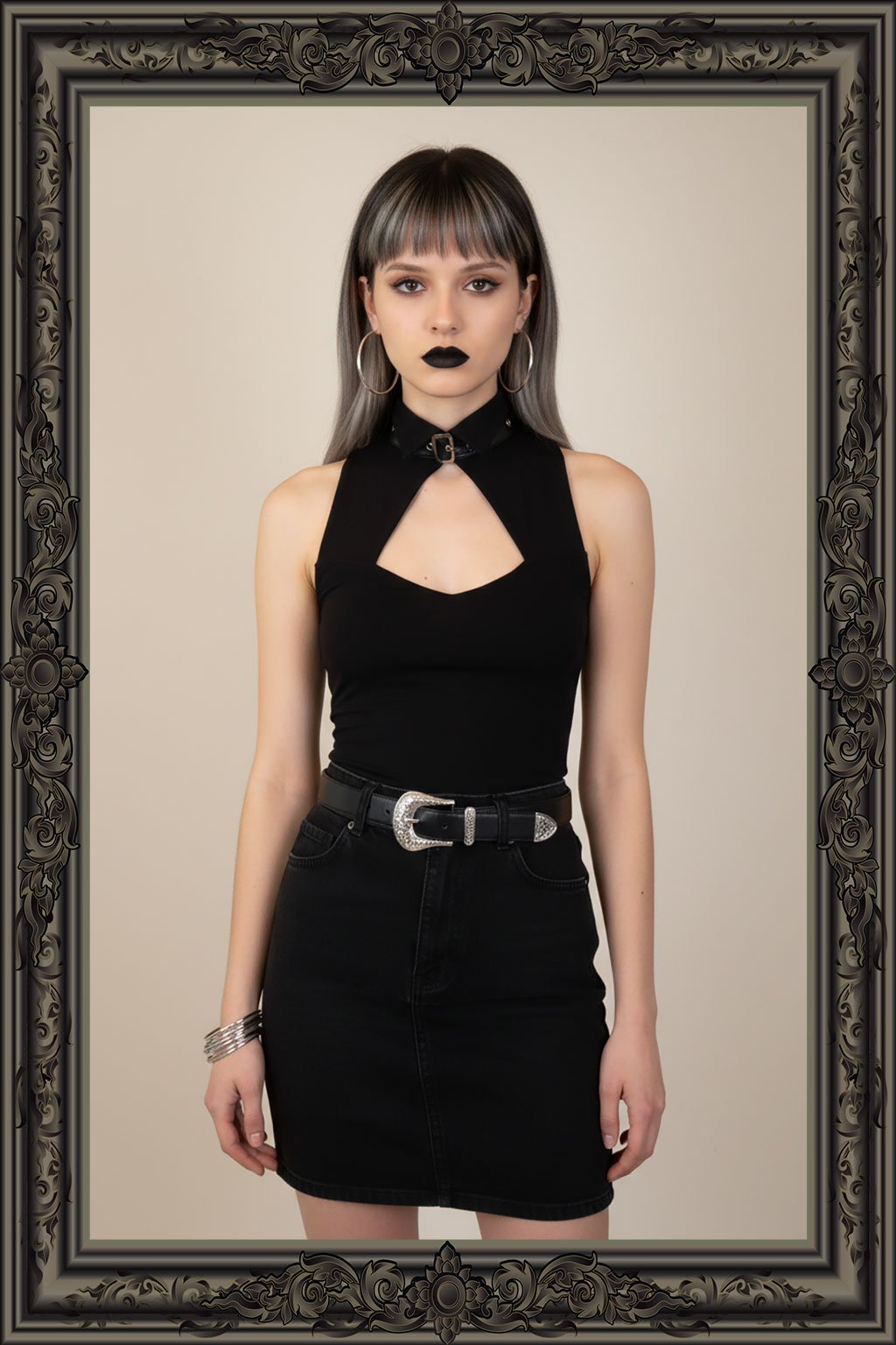 Elegantní černý top je navržen pro ženy, které hledají stylový a sofistikovaný kus do svého šatníku. Top má hlubokým výstřih, který přidává do vašeho outfitu nádech ženství a elegance. Kromě toho je vybaven stojáčkem, který dodává celkovému designu moderní a vkusný vzhled. Zapínání topu je zajištěno pomocí ozdobného pásku se stříbrnou sponou.