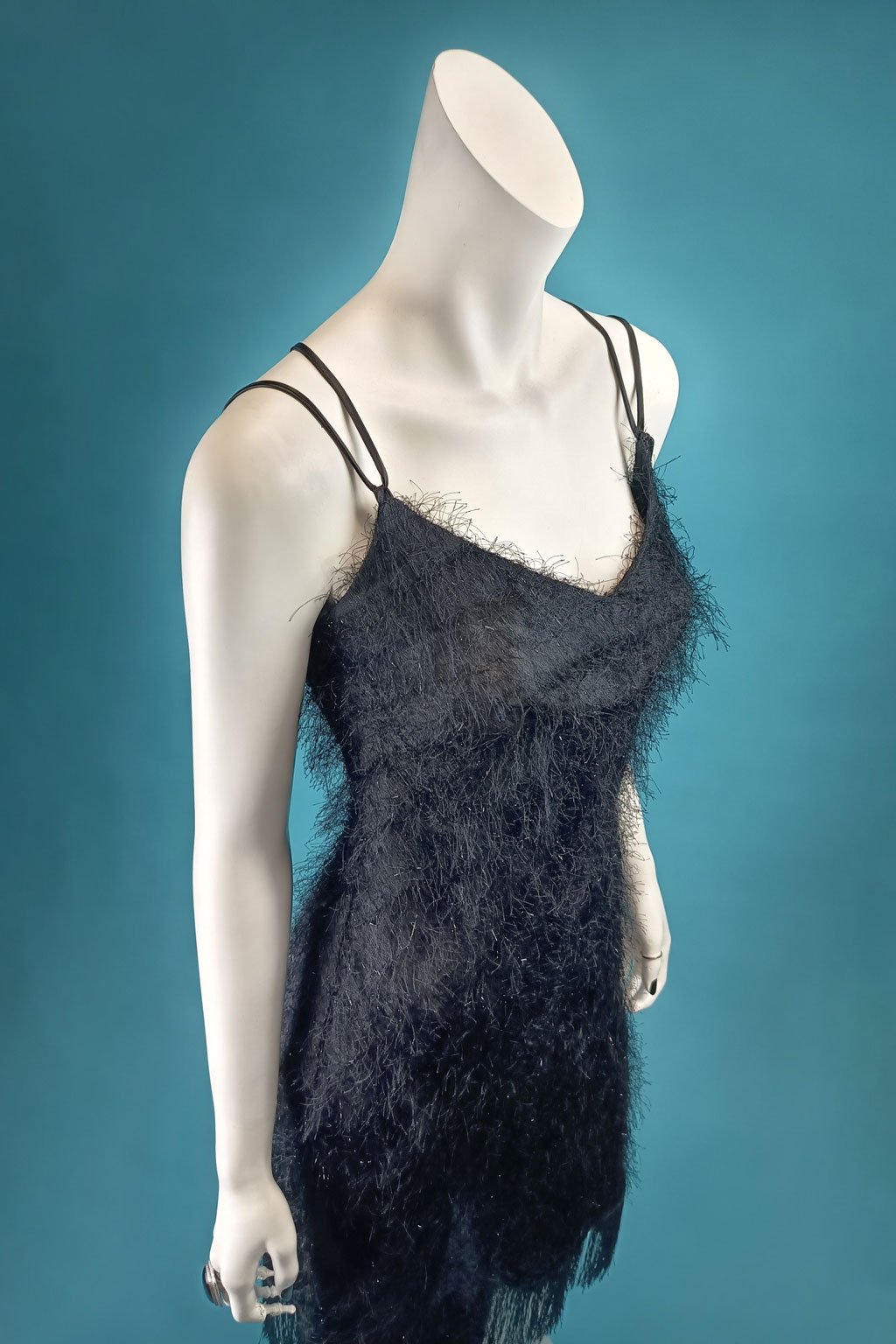 Vychutnejte si eleganci a půvab s našimi černými třášňovými šaty, které jsou dokonalým spojením stylu a komfortu. Nastavitelná délka ramínek a šněrování v hlubokém výstřihu na zadním díle zajišťují, že šaty padnou jako ulité. Dolní okraj lemovaný dlouhými třásněmi přidává šatům dramatičnost v každém pohybu. Díky šikmo střiženému materiálu šaty nádherně splývají a přizpůsobují se vaší postavě. Vysoce kvalitní materiál je nejen krásný, ale také snadno udržovatelný, což z těchto šatů činí ideální volbu pro každou příležitost. Přidejte tyto šaty do svého šatníku a nechte se okouzlit jejich krásou a kvalitou.