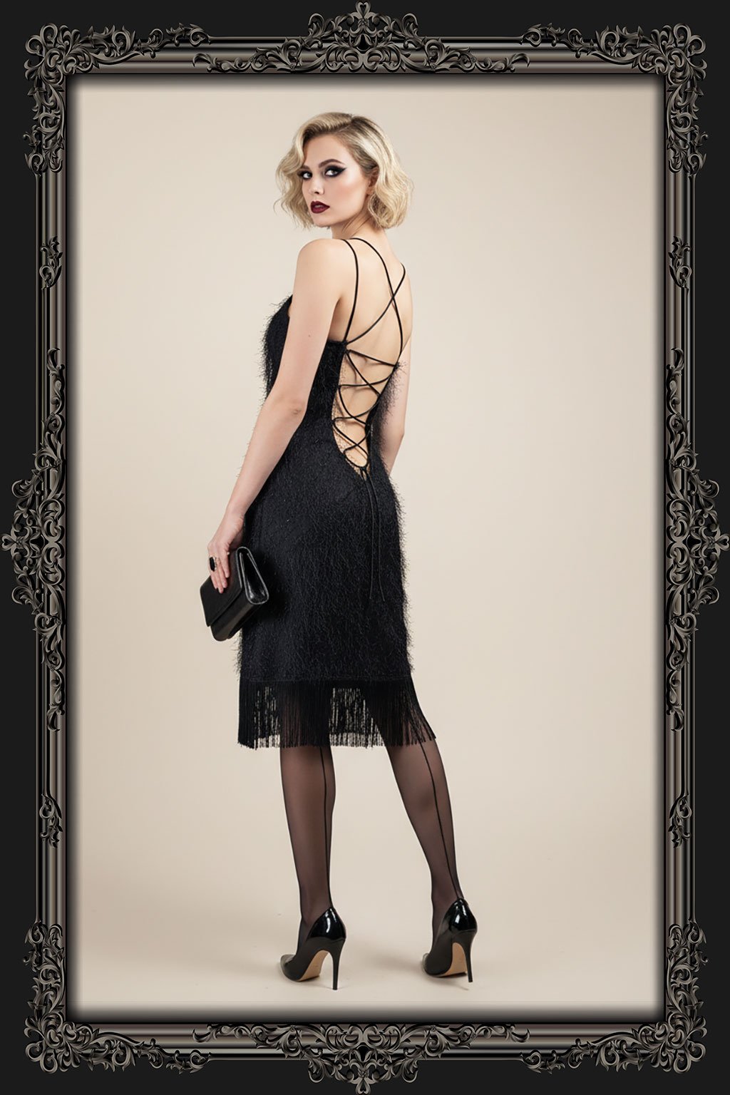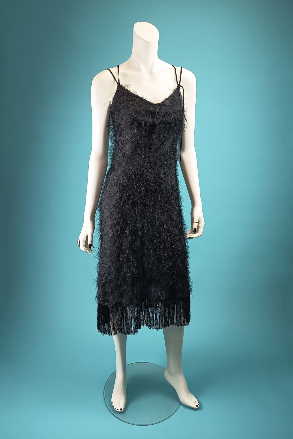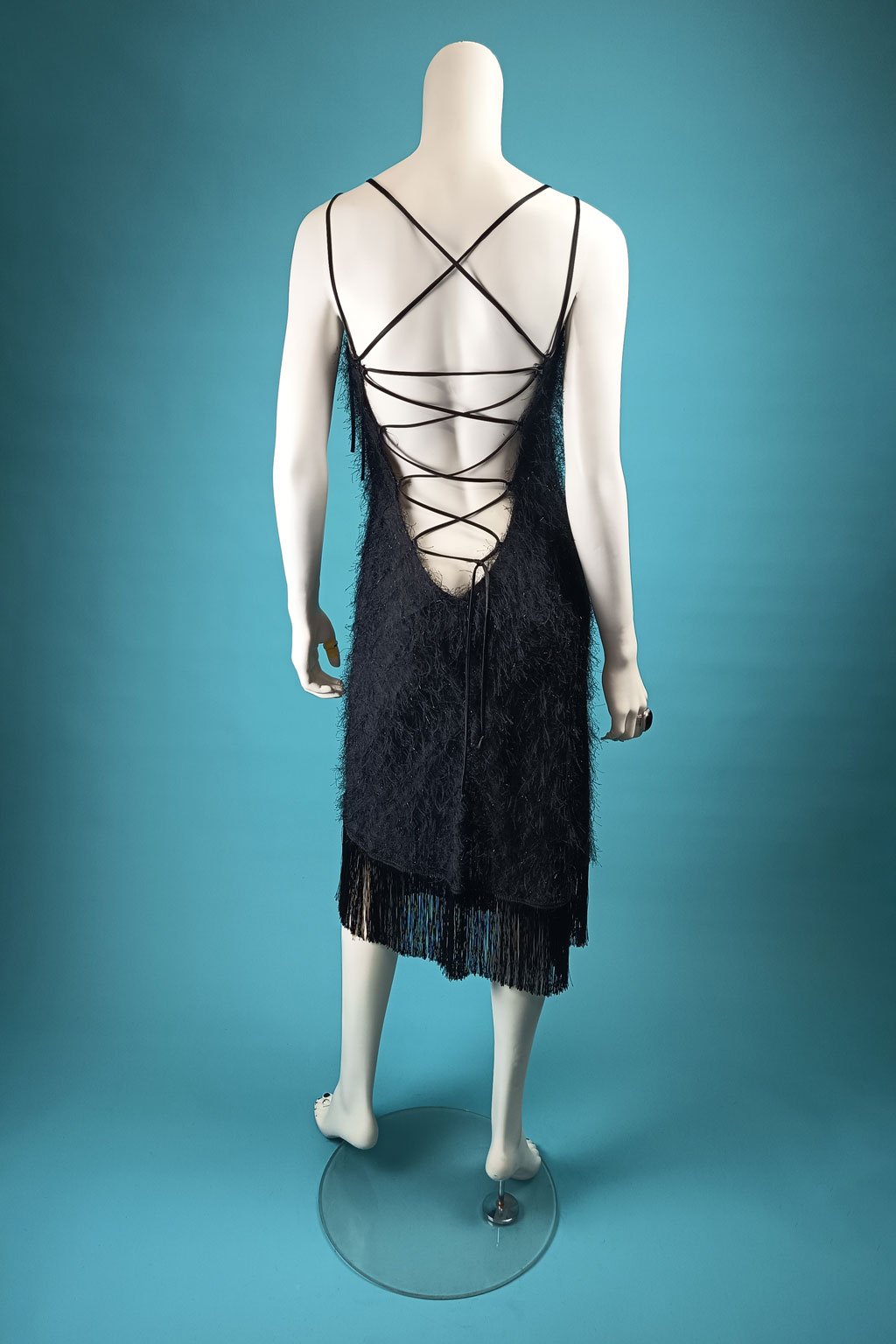 Představujeme vám černé elegantní šaty z materiálu s malými třásněmi, které zaujmou na první pohled. Tyto šaty jsou navrženy s nastavitelnou délkou ramínek a velikosti díky šněrování v hlubokém výstřihu na zadním díle, což umožňuje perfektní přizpůsobení vaší postavě. Dolní okraj šatů je lemován dlouhými třásněmi, který dodává dramatický nádech. Šikmo střižený materiál zajišťuje, že šaty krásně splývají a dokonale kopírují tvar těla. Vyrobeny z velmi kvalitního materiálu, který je snadný na údržbu.