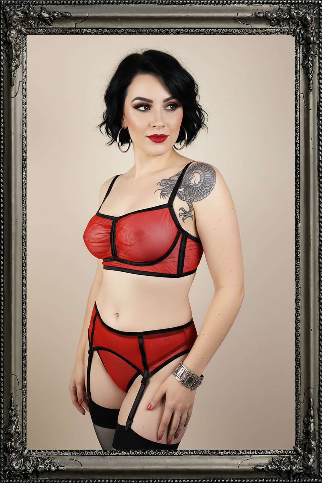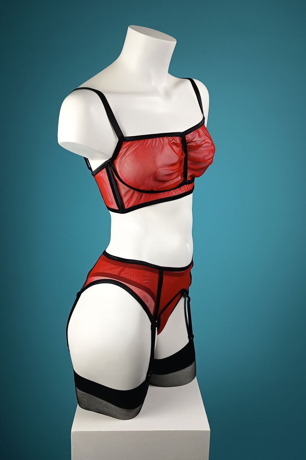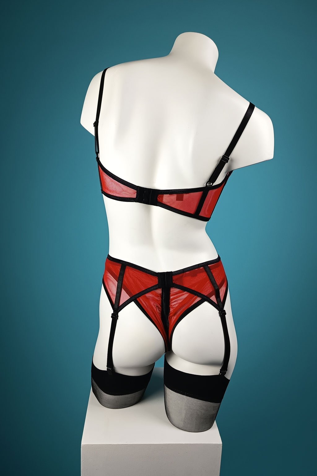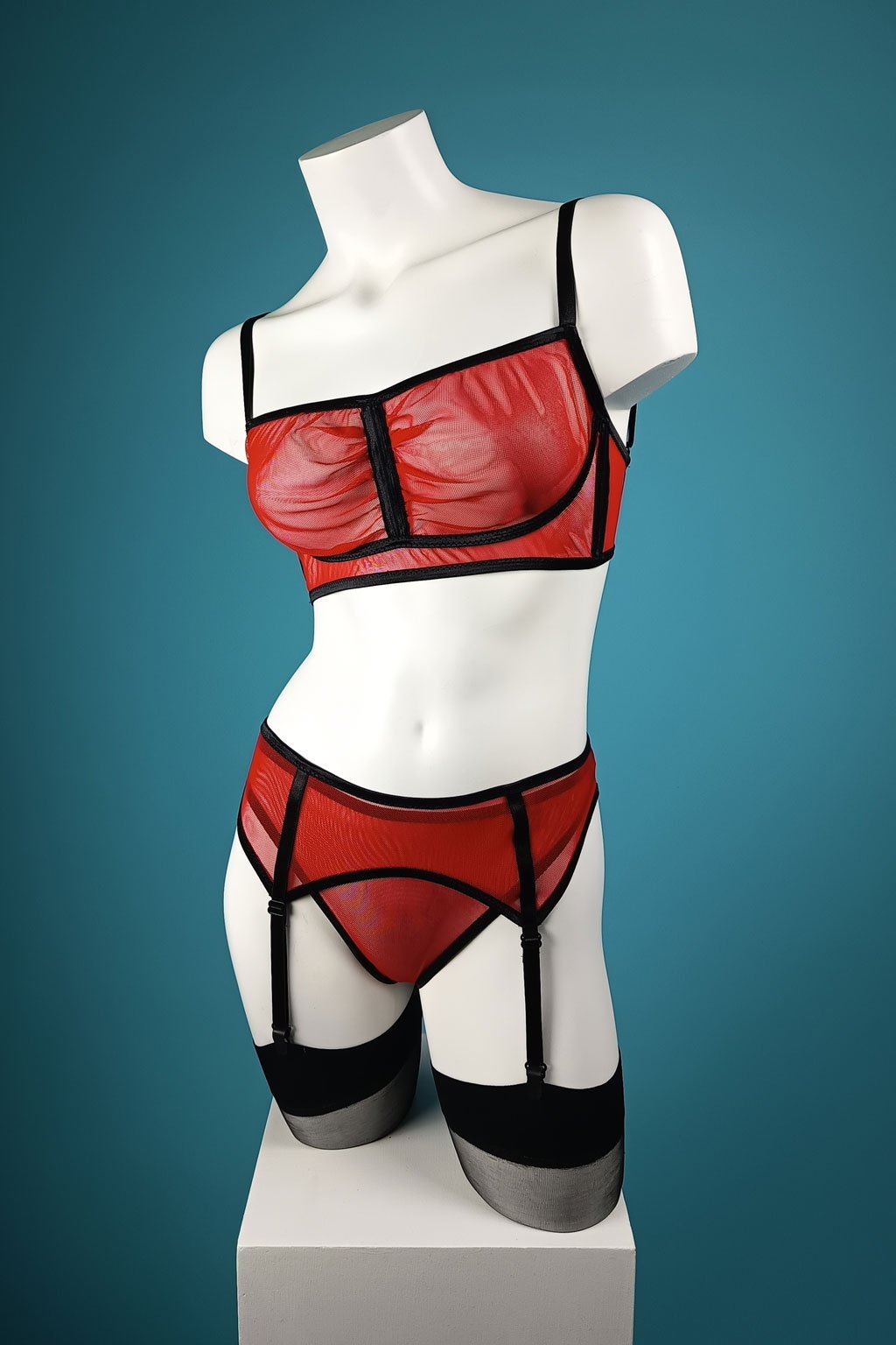 Tahle třídílná souprava je přesně ten typ prádla, které změní náladu v místnosti dřív, než řeknete jediné slovo. Červený transparentní materiál nechá jen tolik fantazie, kolik je potřeba, a černé lemování dodá ostrý, elegantní kontrast, který krásně orámuje křivky.