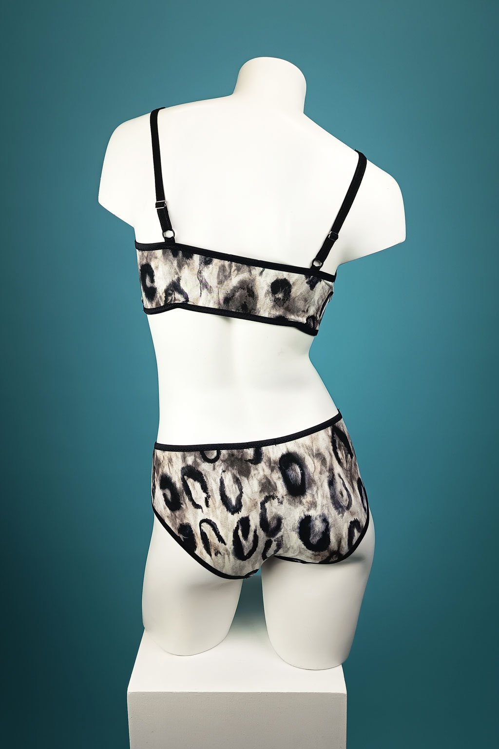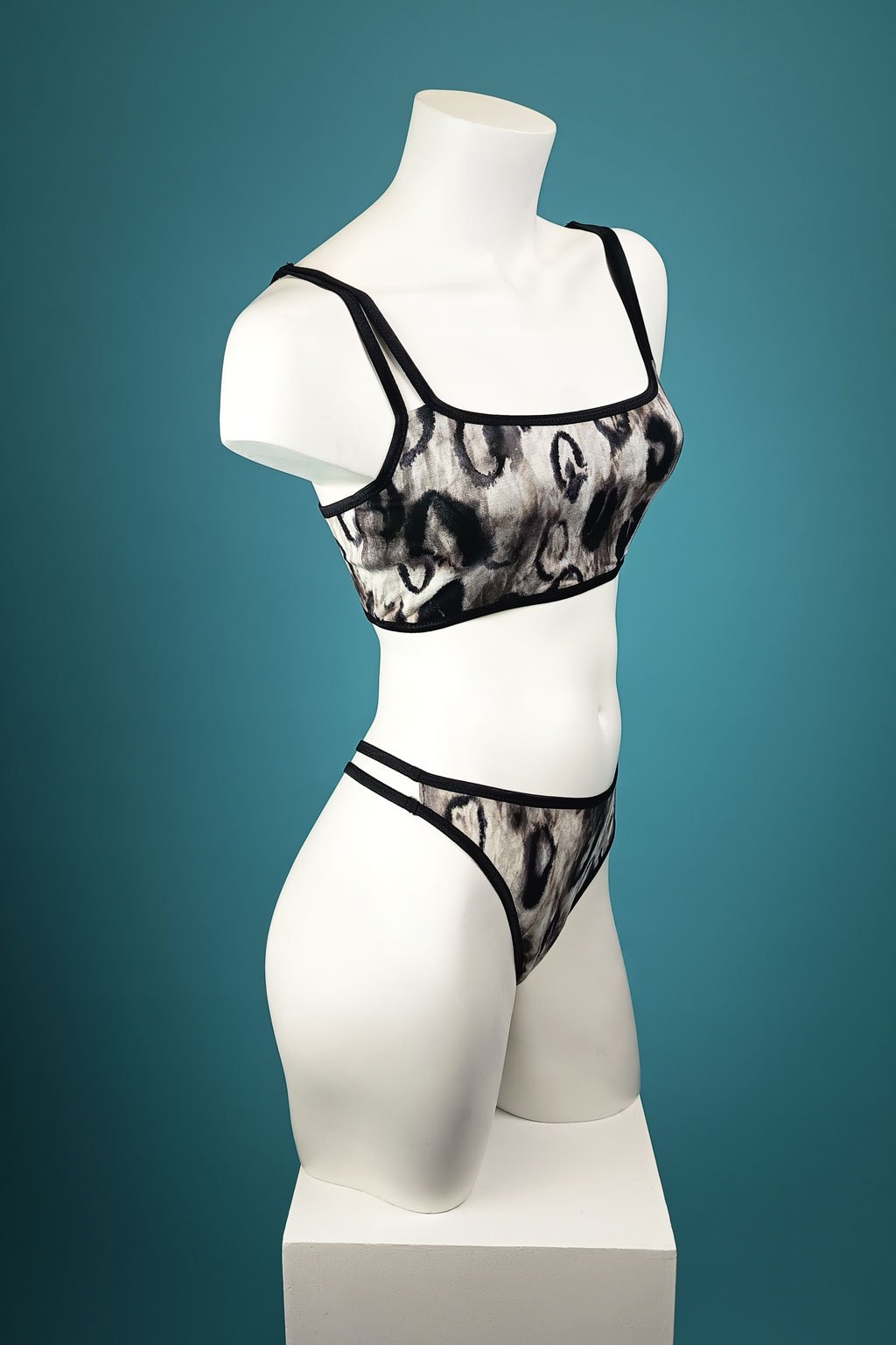 Originální třídílná souprava vyrobená pouze v jednom kuse: lambáda s nastavitelnými ramínky a dvojitým předním dílem plus dvoje kalhotky — klasické i tanga. Hebká viskóza se přizpůsobí tělu a díky precizní ruční práci vypadá set luxusně zblízka i na dálku.