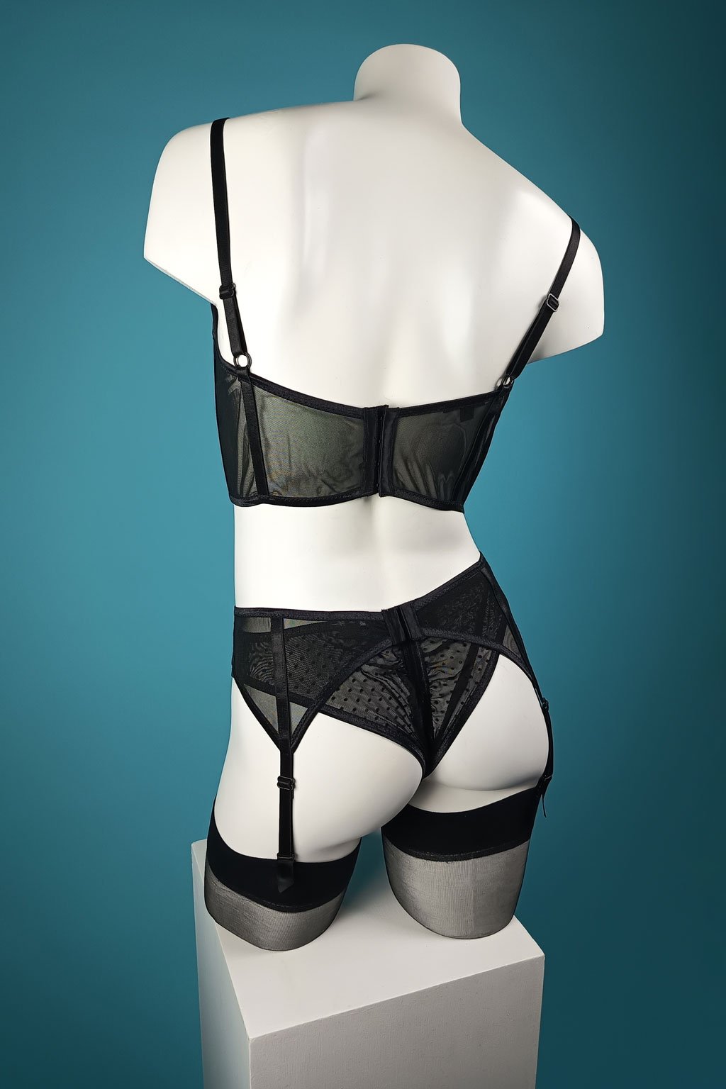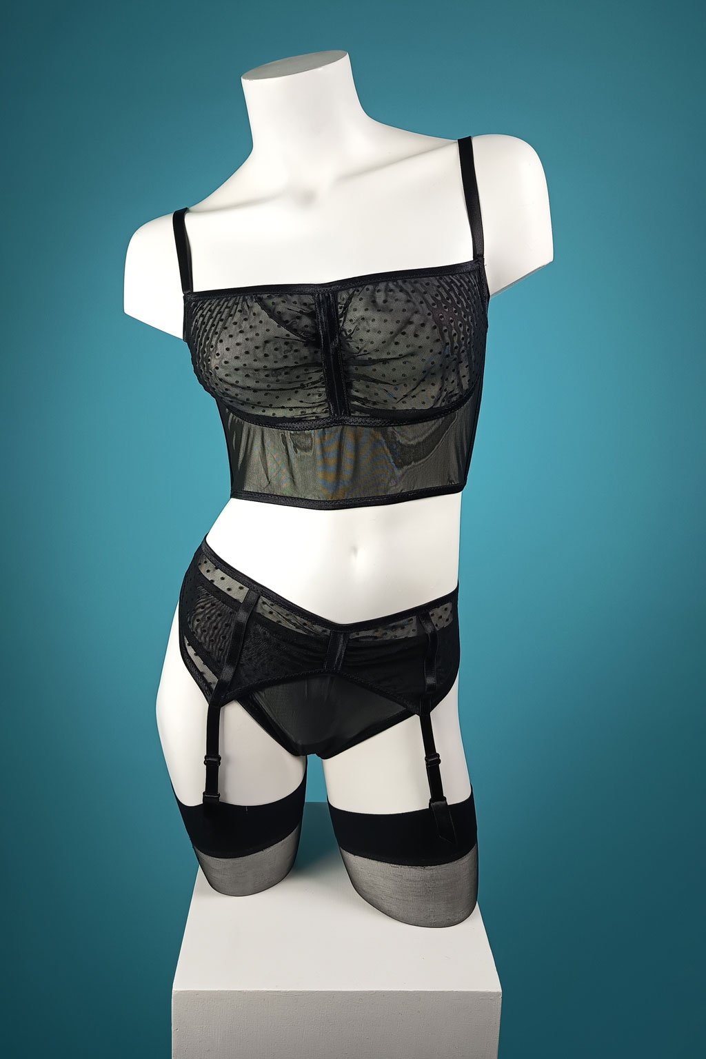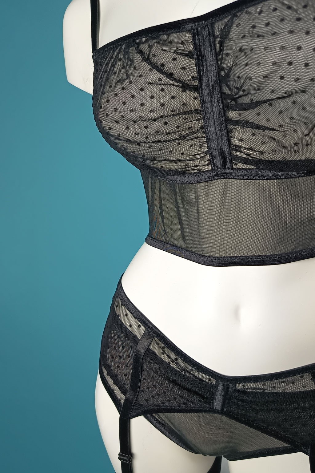 Tahle třídílná souprava je důkaz, že černá umí být něžná i nebezpečně přitažlivá zároveň. Transparentní materiál s jemným puntíkem působí hravě a rafinovaně, zatímco černé lemování krásně orámuje křivky a dodá celku čistý, elegantní tvar.