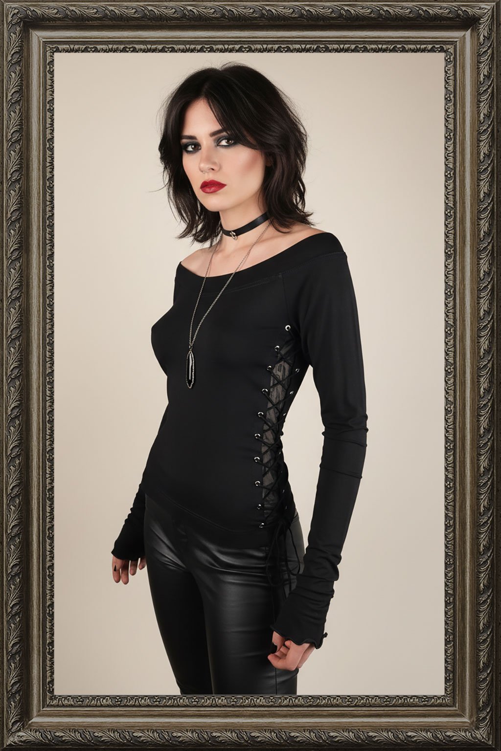 Elegantní triko s odhalenými rameny, ozdobným šněrováním po stranách a prodlouženými rukávy. Vyrobené je z kvalitního příjemného elastického materiálu.