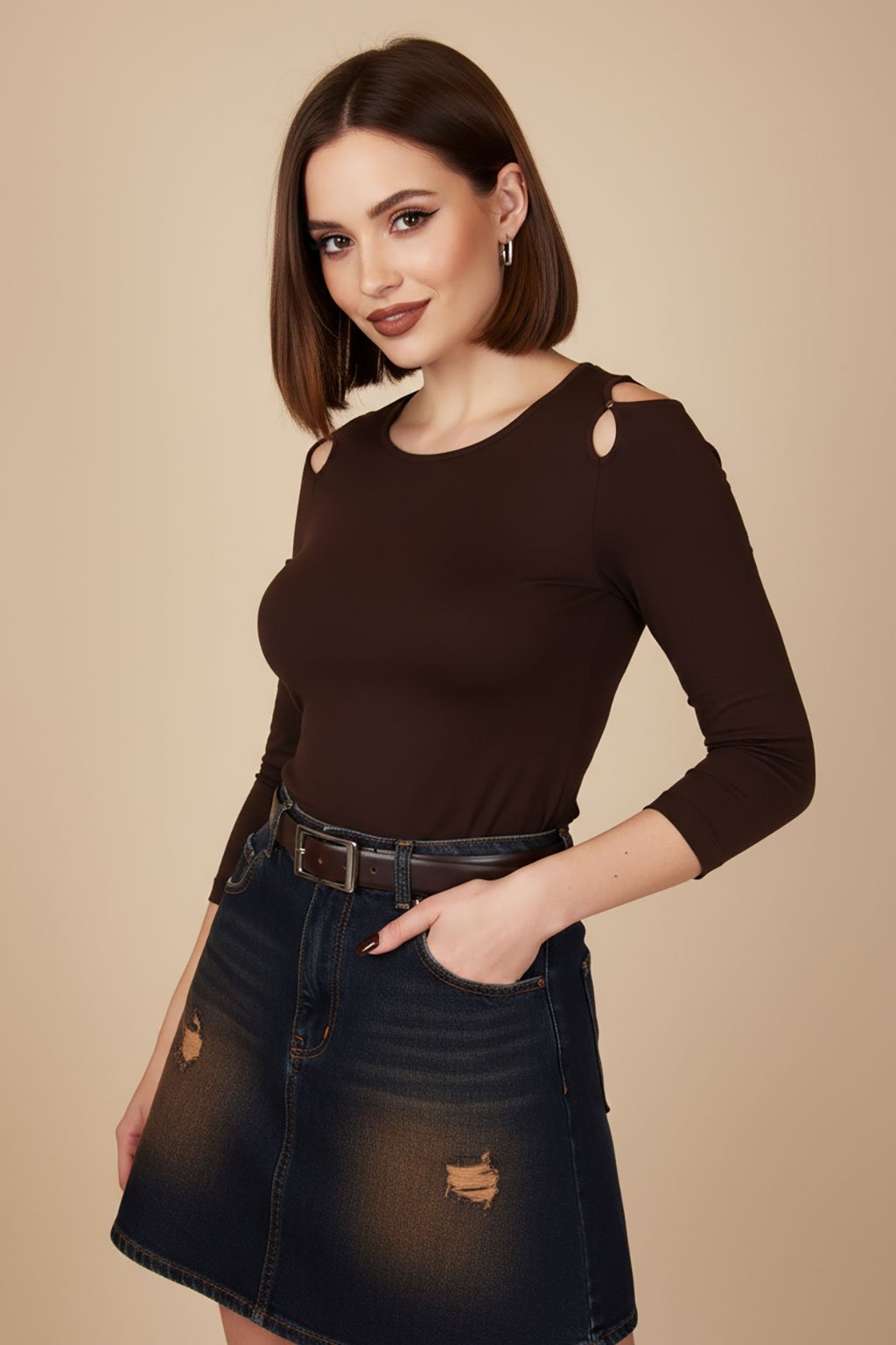 Tričko zdobené průstřihy a kovovými peckami. Vyrobené je z příjemného elastického materiálu.