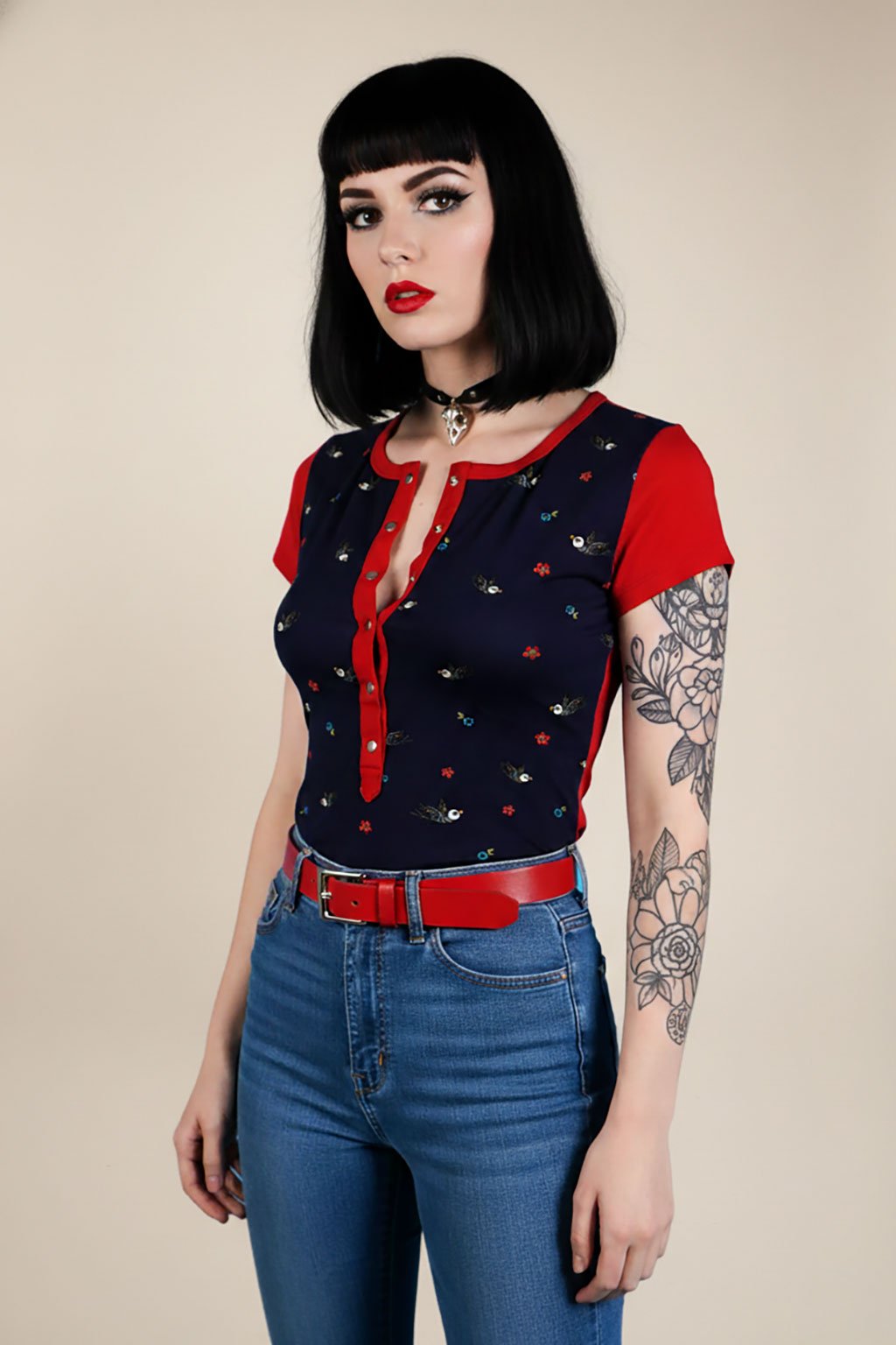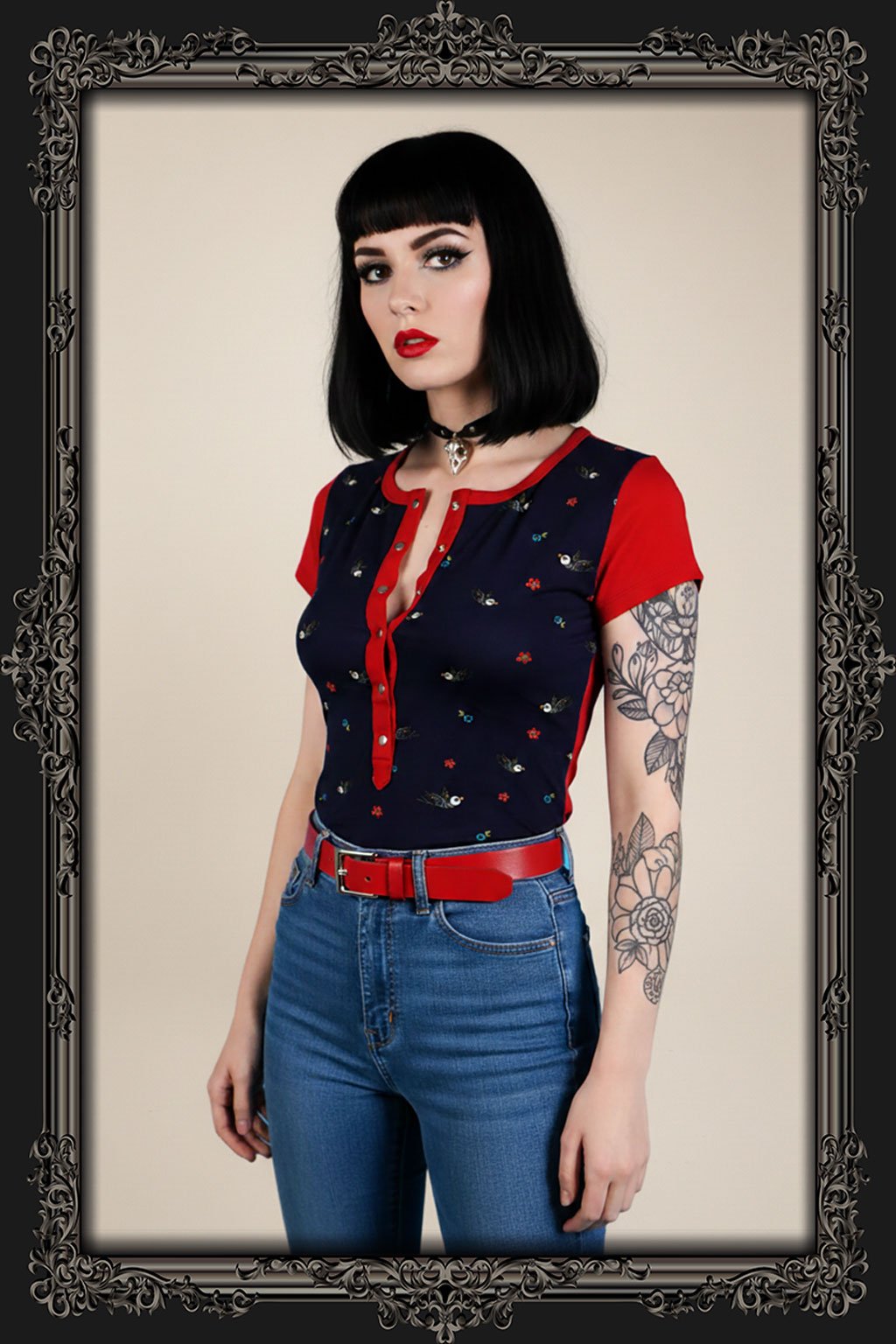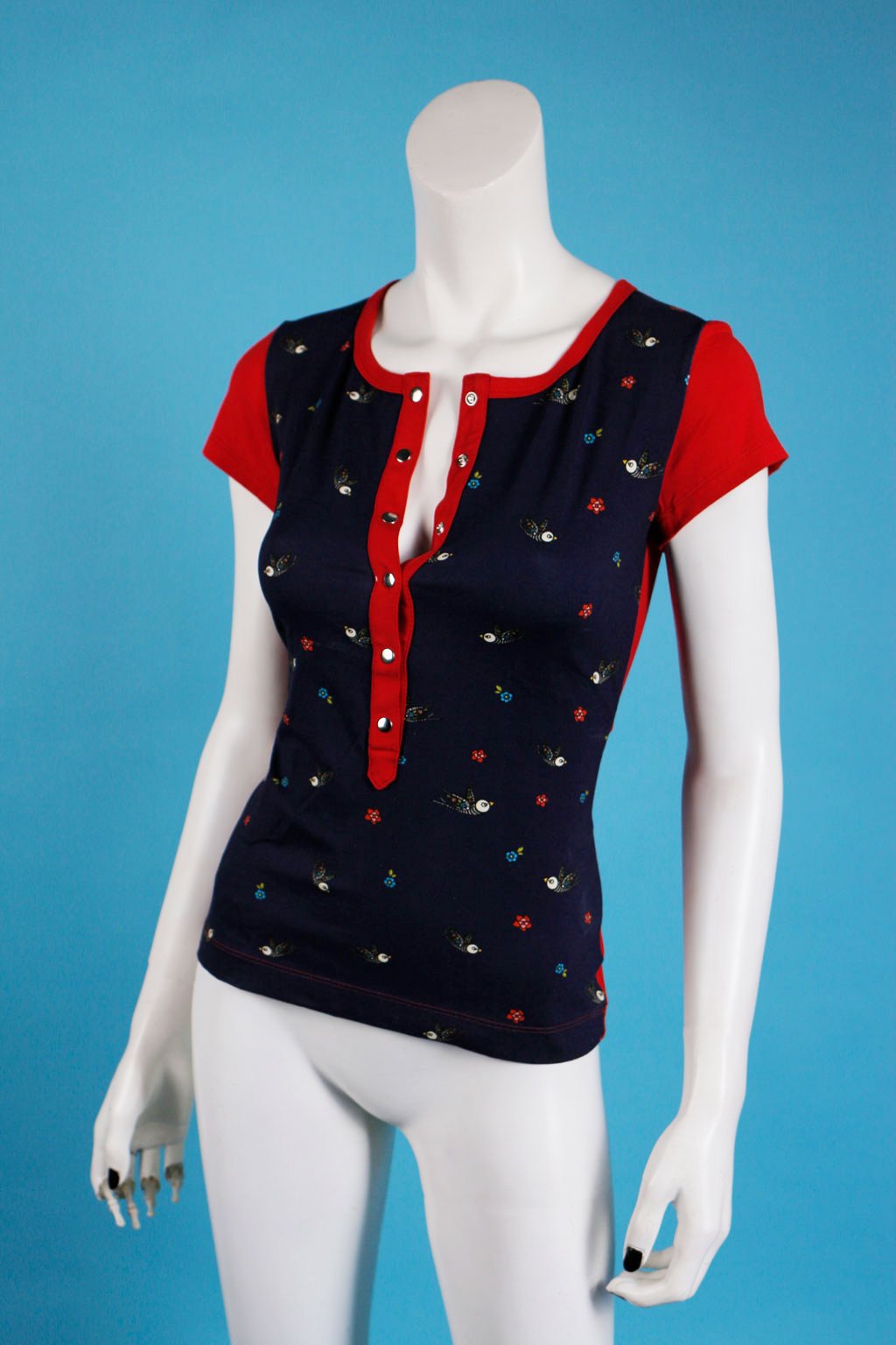Originální triko s hlubokou légou zapínanou na řadu patentů. Geniální triko, které by nemělo chybět v žádném šatníku. Jednoduché, elegantní a velmi praktické. Hodí se na každodenní nošení, tak na neformální večírek, ideální je taky na kojení. Vyrobené je z velmi kvalitního materiálu. Ma předním díle je roztomilý potisk kytiček a koster ptáčků.