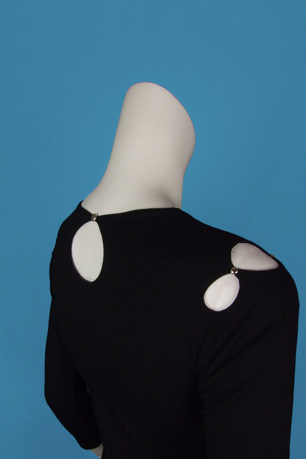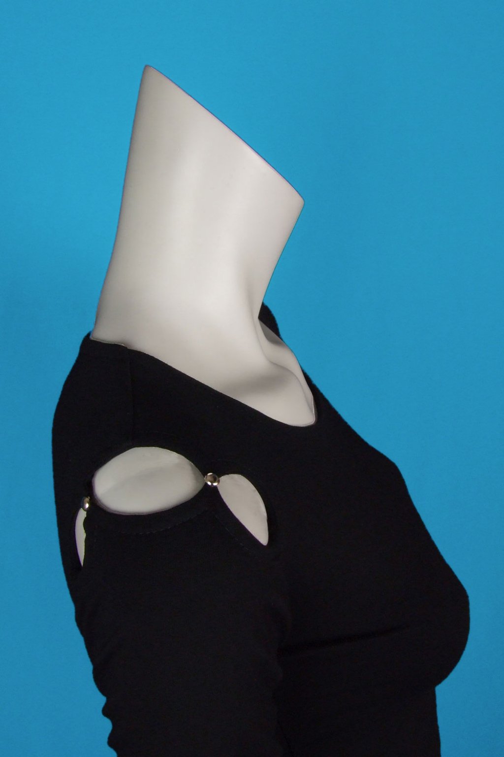 Černé tričko zdobené rafinovanými průstřihy na ramenou a za krkem je stylovým a moderním kouskem, který přitáhne pozornost. Kovové pecky přidávají elegantní a sofistikovaný vzhled. Tričko si můžete objednat s tříčtvrtečními nebo dlouhými rukávy, podle vašich preferencí. Vyrobené z kvalitního materiálu, zajišťuje maximální komfort a dlouhou životnost. Tento designový kousek je ideální pro každodenní nošení i pro speciální příležitosti, kdy chcete vyniknout.