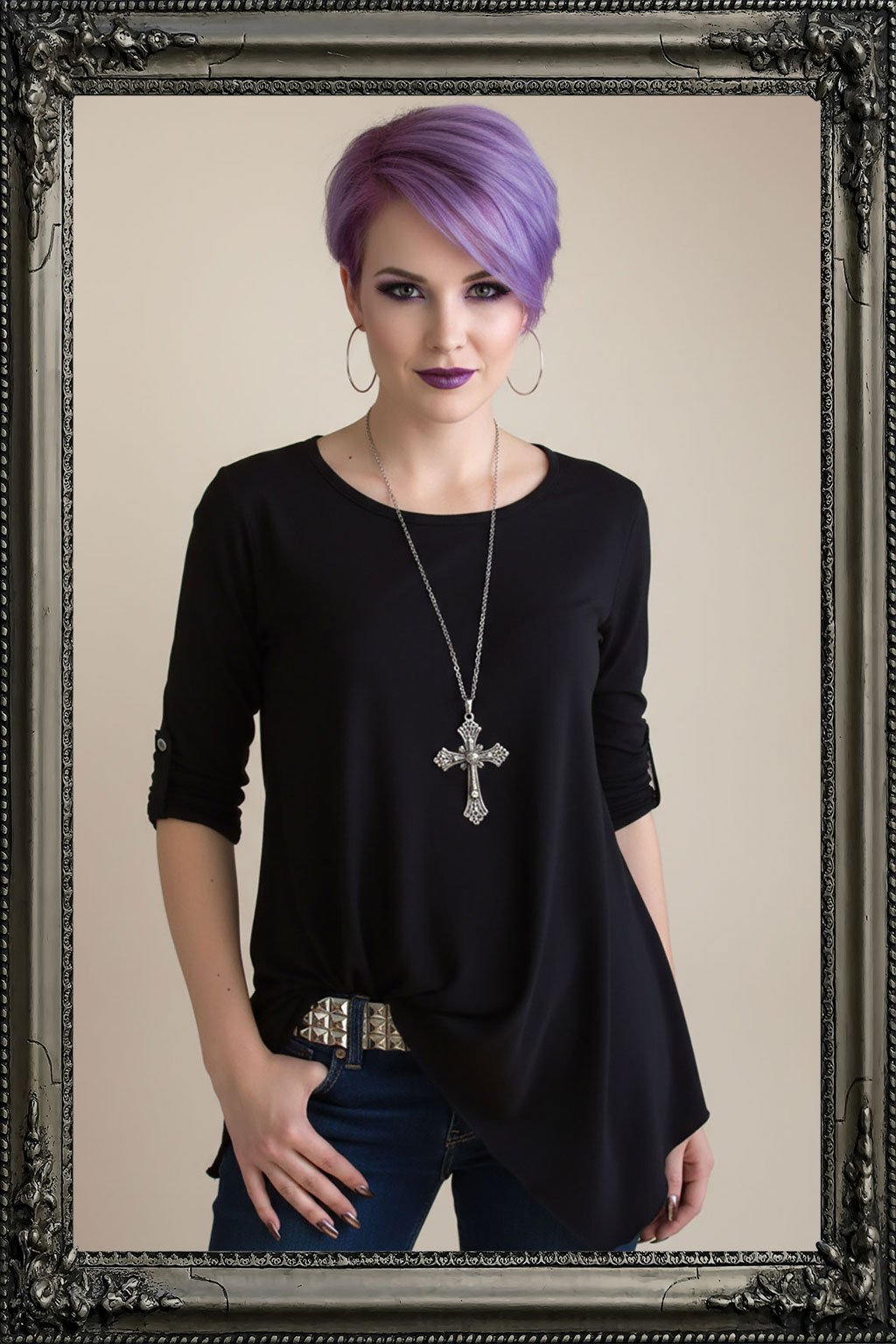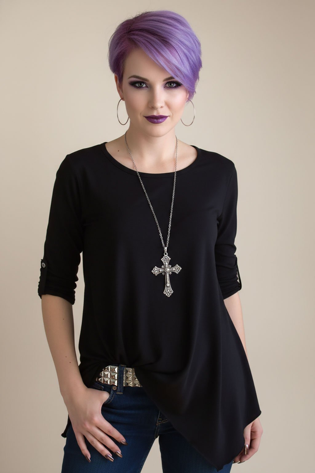 Volná tunika s cípy v dolním okraji. Skvěle schová bříško a vlastně úplně všechno co se vám kolem pasu nelíbí. Je pohodlné a dá se třeba jen ležérně zastrčit v předním díle do kalhot nebo pod pásek...