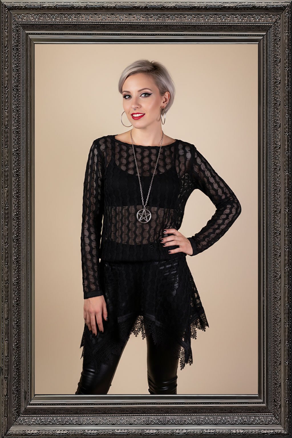 Tato černá ležérní tunika z transparentního materiálu lemovaná vzdušnou krajkou je ideální volbou pro ženy, které vyhledávají pohodlí a zároveň se chtějí stylově lišit. Tunika má volný střih, který poskytuje neformální a uvolněný vzhled, zároveň však zachovává moderní a elegantní design s nádechem gothic stylu.
