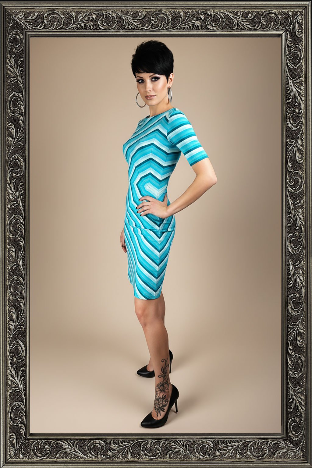 Délka a střih šatů jsou navrženy tak, aby podtrhovaly ženskou siluetu a zajišťovaly elegantní vzhled. Pruhovaný vzor opticky tvaruje postavu a dodává ženskost každému pohybu.